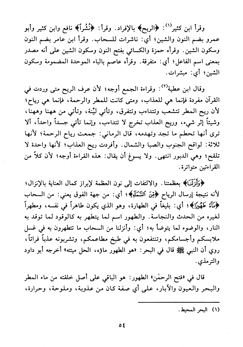 قال في "فتح الرحمن" الطهور: هو الباقي على أصل خلقته من ماء المطر والبحر والعيون والآبار، على أي صفة كان من عذوبة، وملوحة، وحرارة،