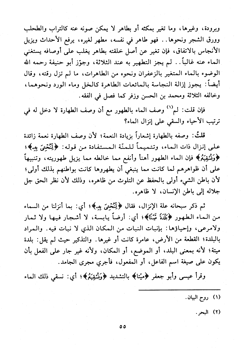 قلتُ: وصفه بالطهارة إشعارًا بزيادة النعمة؛ لأن وصف الطهارة نعمة زائدة على إنزال ذات الماء، وتتميمًا للمنة المستفادة من قوله: {لِنُحْيِيَ بِهِ}؛ {وَنُسْقِيَهُ} فإن الماء الطهور أهنأ وأنفع مما خالطه مما يزيل طهوريته، وتنبيهًا على أن ظواهرهم لما كانت مما ينبغي أن يطهروها كانت بواطنهم بذلك أولى؛ لأن باطن الشيء أولى بالحفظ عن التلوث من ظاهره، وذلك لأن نظر الحق جل جلاله إلى باطن الإنسان، لا ظاهره.