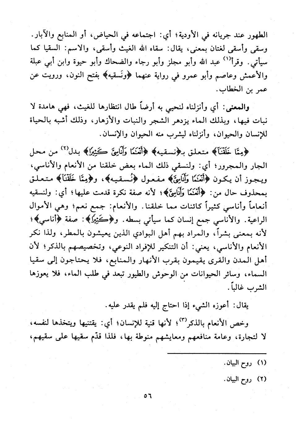 {مِمَّا خَلَقْنَا} متعلق بـ {نسقيه} {أَنْعَامًا وَأَنَاسِيَّ كَثِيرًا} بدل (¬2) من محل الجار والمجرور؛ أي: ولنسقي ذلك الماء بعض خلقنا من الأنعام والأناسي، ويجوز أن يكون {أَنْعَامًا وَأَنَاسِيَّ} مفعول {نُسقيه}، و {مِمَّا خَلَقْنَا} متعلق بمحذوف حال من: {أَنْعَامًا وَأَنَاسِيَّ}؛ لأنه صفة نكرة قدمت عليها؛ أي: ولنسقيه أنعامًا وأناسي كثيرًا كائنات مما خلقنا. والأنعام: جمع نعم؛ وهي الأموال الراعية. والأناسي جمع إنسان كما سيأتي بسطه. و {كَثِيرًا}: صفة {أناسي}؛ لأنه بمعنى بشرًا، والمراد بهم أهل البوادي الذين يعيشون بالمطر، ولذا نكر الأنعام والأناسي، يعني: أن التنكير للإفراد النوعي، وتخصيصهم بالذكر؛ لأن أهل المدن والقرى يقيمون بقرب الأنهار والمنابع، فلا يحتاجون إلى سقيا السماء، وسائر الحيوانات من الوحوش والطيور تبعد في طلب الماء، فلا يعوزها الشرب غالبًا.