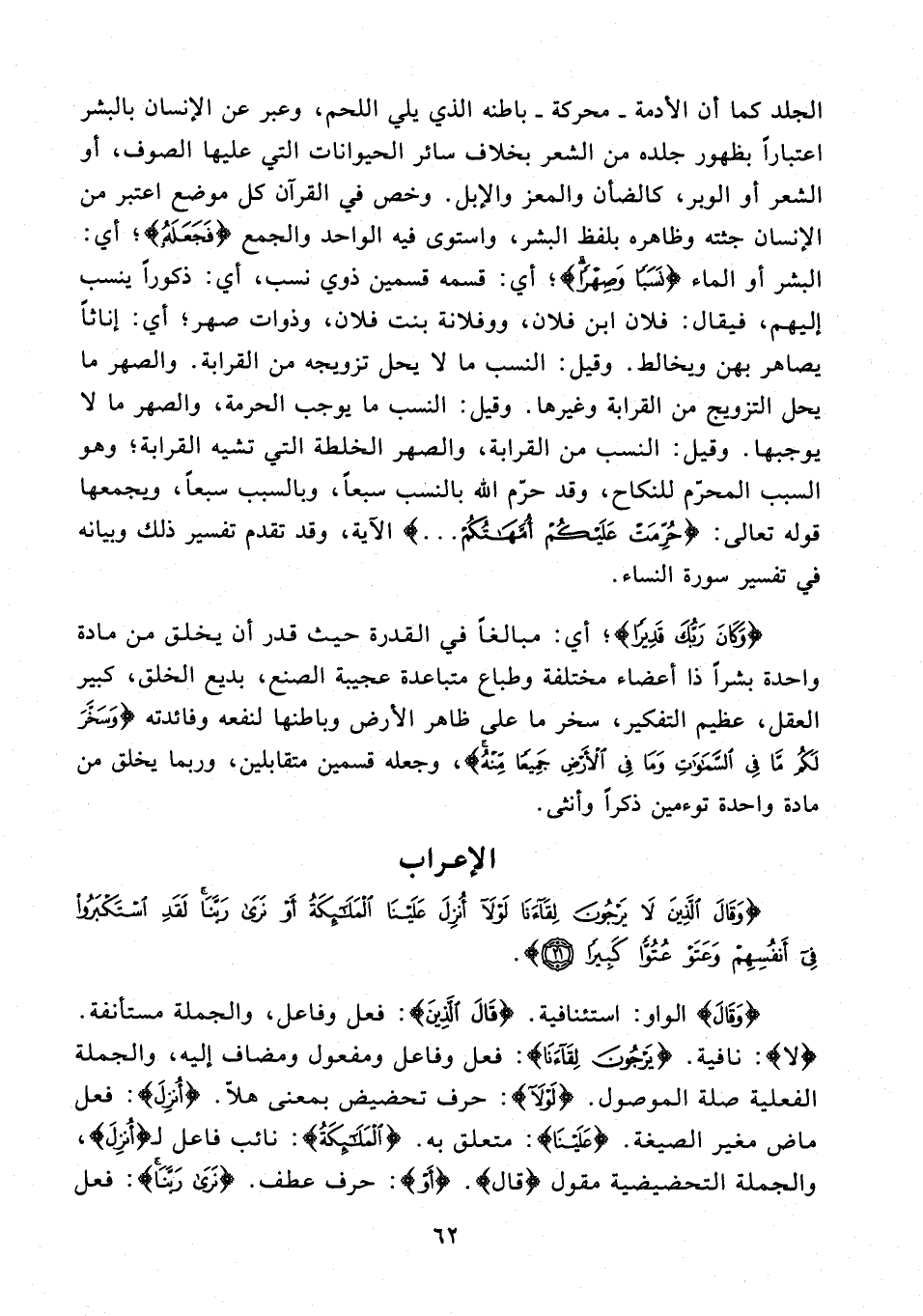 الجلد كما أن الأدمة - محركة - باطنه الذي يلي اللحم، وعبر عن الإنسان بالبشر اعتبارًا بظهور جلده من الشعر بخلاف سائر الحيوانات التي عليها الصوف، أو الشعر أو الوبر، كالضأن والمعز والإبل. وخص في القرآن كل موضع اعتبر من الإنسان جثته وظاهره بلفط البشر، واستوى فيه الواحد والجمع {فَجَعَلَهُ}؛ أي: البشر أو الماء {نَسَبًا وَصِهْرًا}؛ أي: قسمه قسمين ذوي نسب، أي: ذكورًا ينسب إليهم، فيقال: فلان ابن فلان، ووفلانة بنت فلان، وذوات صهر؛ أي: إناثًا يصاهر بهن ويخالط. وقيل: النسب ما لا يحل تزويجه من القرابة. والصهر ما يحل التزويج من القرابة وغيرها. وقيل: النسب ما يوجب الحرمة، والصهر ما لا يوجبها. وقيل: النسب من القرابة، والصهر الخلطة التي تشيه القرابة؛ وهو السبب المحرّم للنكاح، وقد حرّم الله بالنسب سبعًا، وبالسبب سبعًا، ويجمعها قوله تعالى: {حُرِّمَتْ عَلَيْكُمْ أُمَّهَاتُكُمْ ...} الآية، وقد تقدم تفسير ذلك وبيانه في تفسير سورة النساء.