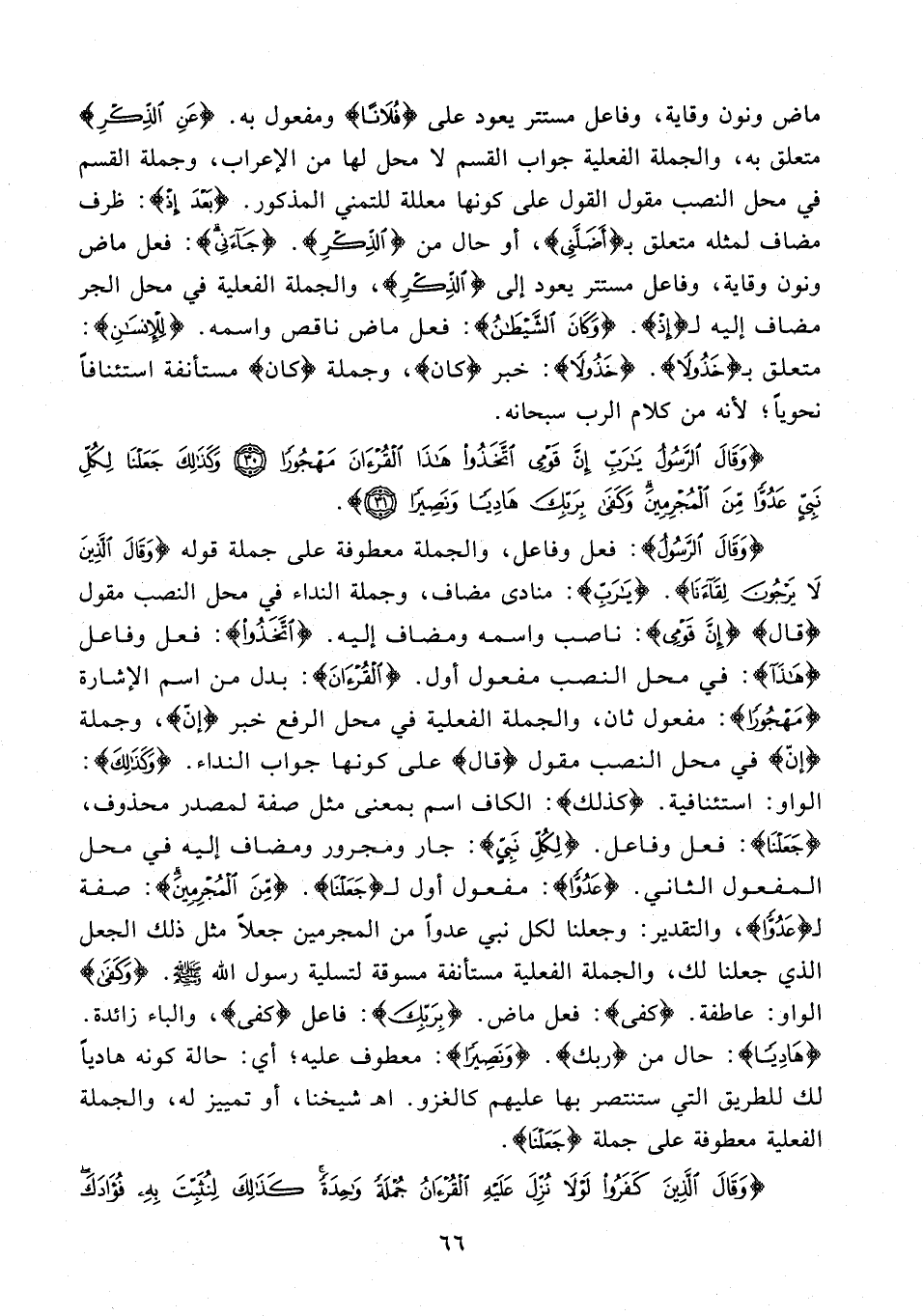 {وَقَالَ الرَّسُولُ}: فعل وفاعل، والجملة معطوفة على جملة قوله {وَقَالَ الَّذِينَ لَا يَرْجُونَ لِقَاءَنَا}. {يَا رَبِّ}: منادى مضاف، وجملة النداء في محل النصب مقول {قال} {إِنَّ قَوْمِي}: ناصب واسمه ومضاف إليه. {اتَّخَذُوا}: فعل وفاعل {هَذَا}: في محل النصب مفعول أول. {الْقُرْآنَ}: بدل من اسم الإشارة {مَهْجُورًا}: مفعول ثان، والجملة الفعلية في محل الرفع خبر {إنّ}، وجملة {إنّ} في محل النصب مقول {قال} على كونها جواب النداء. {وَكَذَلِكَ}: الواو: استئنافية. {كذلك}: الكاف اسم بمعنى مثل صفة لمصدر محذوف، {جَعَلْنَا}: فعل وفاعل. {لِكُلِّ نَبِيٍّ}: جار ومجرور ومضاف إليه في محل المفعول الثاني. {عَدُوًّا}: مفعول أول لـ {جَعَلْنَا}. {مِنَ الْمُجْرِمِينَ}: صفة لـ {عَدُوًّا}، والتقدير: وجعلنا لكل نبي عدوًا من المجرمين جعلًا مثل ذلك الجعل الذي جعلنا لك، والجملة الفعلية مستأنفة مسوقة لتسلية رسول الله - صلى الله عليه وسلم -. {وَكَفَى} الواو: عاطفة. {كفى}: فعل ماض. {بِرَبِّكَ}: فاعل {كفى}، والباء زائدة. {هَادِيًا}: حال من {ربك}. {وَنَصِيرًا}: معطوف عليه؛ أي: حالة كونه هاديًا لك للطريق التي ستنتصر بها عليهم كالغزو. اهـ شيخنا، أو تمييز له، والجملة الفعلية معطوفة على جملة {جَعَلْنَا}.