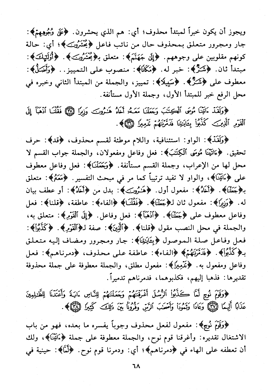 {وَلَقَدْ}: الواو: استئنافية، واللام موطئة لقسم محذوف، {قد}: حرف تحقيق. {آتَيْنَا مُوسَى الْكِتَابَ}: فعل وفاعل ومفعولان، والجملة جواب القسم لا محل لها من الإعراب، وجملة القسم مستأنفة. {وَجَعَلْنَا}: فعل وفاعل معطوف على {آتَيْنَا}، والواو لا تفيد ترتيبًا كما مر في مبحث التفسير. {مَعَهُ}: متعلق بـ {جَعَلْنَا}. {أَخَاهُ}: مفعول أول. {هَارُونَ}: بدل من {أَخَاهُ}: أو عطف بيان له. {وَزِيرًا}: مفعول ثان لـ {جَعَلْنَا}. {فَقُلْنَا} {الفاء}: عاطفة، {قلنا}: فعل وفاعل معطوف على {جَعَلْنَا}. {اذْهَبَا}: فعل وفاعل. {إِلَى الْقَوْمِ}: متعلق به، والجملة في محل النصب مقول {قلنا}. {الَّذِينَ}: صفة لـ {الْقَوْمِ}. {كَذَّبُوا}: فعل وفاعل صلة الموصول {بِآيَاتِنَا}: جار ومجرور ومضاف إليه متعلق بـ {كَذَّبُوا}. {فَدَمَّرْنَاهُمْ} {الفاء}: عاطفة على محذوف، {دمرناهم}: فعل وفاعل ومفعول به. {تَدْمِيرًا}: مفعول مطلق، والجملة معطوفة على جملة محذوفة تقديرها: فذهبا إليهم، فكذبوهما، فدمرناهم تدميرًا.