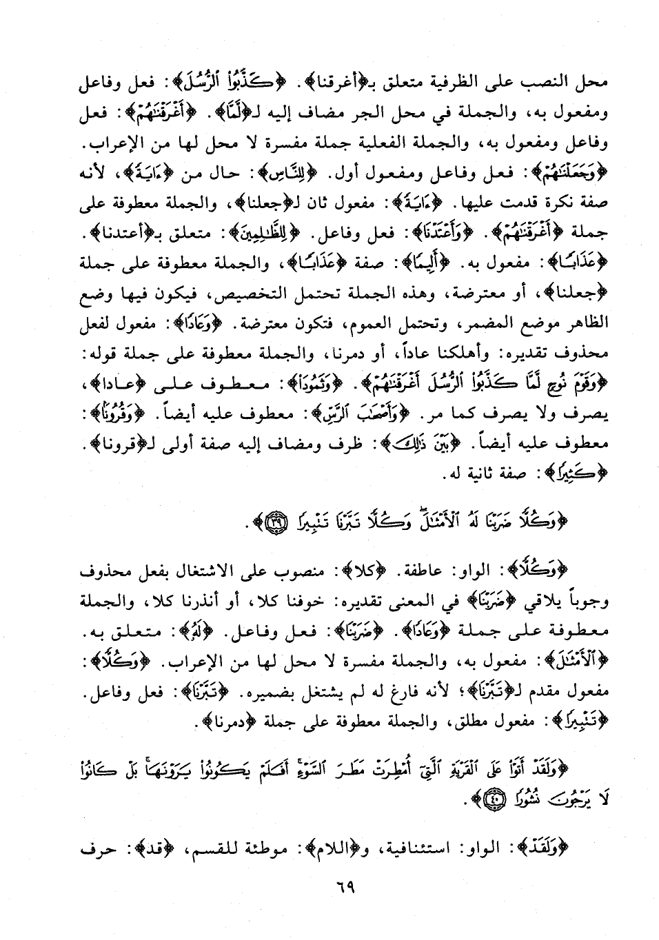 {وَكُلًّا}: الواو: عاطفة. {كلا}: منصوب على الاشتغال بفعل محذوف وجوبًا يلاقي {ضَرَبْنَا} في المعنى تقديره: خوفنا كلا، أو أنذرنا كلا، والجملة معطوفة على جملة {وَعَادًا}. {ضَرَبْنَا}: فعل وفاعل. {لَهُ}: متعلق به، {الْأَمْثَالَ}: مفعول به، والجملة مفسرة لا محل لها من الإعراب. {وَكُلًّا}: مفعول مقدم لـ {تَبَّرْنَا}؛ لأنه فارغ له لم يشتغل بضميره. {تَبَّرْنَا}: فعل وفاعل. {تَتْبِيرًا}: مفعول مطلق، والجملة معطوفة على جملة {دمرنا}.