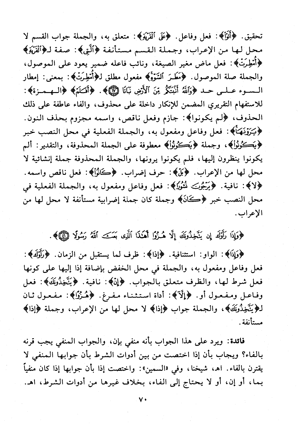 {وَإِذَا}: الواو: استئنافية. {إذا}: ظرف لما يستقبل من الزمان. {رَأَوْكَ}: فعل وفاعل ومفعول به، والجملة في محل الخفض بإضافة إذا إليها على كونها فعل شرط لها، والظرف متعلق بالجواب. {إِنْ}: نافية. {يَتَّخِذُونَكَ}: فعل وفاعل ومفعول أو. {إِلَّا}: أداة استثناء مفرغ. {هُزُوًا}: مفعول ثان لـ {يَتَّخِذُونَكَ}، والجملة جواب {إذا} لا محل لها من الإعراب، وجملة {إذا} مستأنفة.