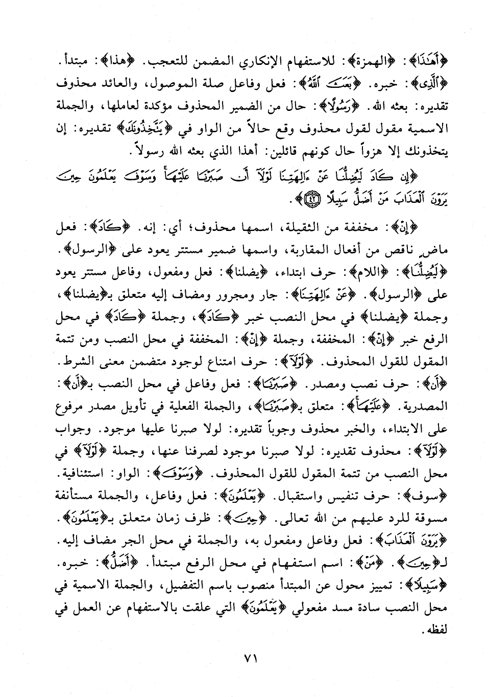 {إِنْ}: مخففة من الثقيلة، اسمها محذوف؛ أي: إنه. {كَادَ}: فعل ماضٍ ناقص من أفعال المقاربة، واسمها ضمير مستتر يعود على {الرسول}. {لَيُضِلُّنَا}: {اللام}: حرف ابتداء، {يضلنا}: فعل ومفعول، وفاعل مستتر يعود على {الرسول}. {عَنْ آلِهَتِنَا}: جار ومجرور ومضاف إليه متعلق بـ {يضلنا}، وجملة {يضلنا} في محل النصب خبر {كَادَ}، وجملة {كَادَ} في محل الرفع خبر {إِنْ}: المخففة، وجملة {إِنْ}: المخففة في محل النصب ومن تتمة المقول للقول المحذوف. {لَوْلَا}: حرف امتناع لوجود متضمن معنى الشرط. {أَن}: حرف نصب ومصدر. {صَبَرْنَا}: فعل وفاعل في محل النصب بـ {أَن}: المصدرية. {عَلَيْهَا}: متعلق بـ {صَبَرْنَا}، والجملة الفعلية في تأويل مصدر مرفوع على الابتداء، والخبر محذوف وجوبًا تقديره: لولا صبرنا عليها موجود. وجواب {لَوْلَا}: محذوف تقديره: لولا صبرنا موجود لصرفنا عنها، وجملة {لَوْلَا} في محل النصب من تتمة المقول للقول المحذوف. {وَسَوْفَ}: الواو: استئنافية. {سوف}: حرف تنفيس واستقبال. {يَعْلَمُونَ}: فعل وفاعل، والجملة مستأنفة مسوقة للرد عليهم من الله تعالى. {حِينَ}: ظرف زمان متعلق بـ {يَعْلَمُونَ}. {يَرَوْنَ الْعَذَابَ}: فعل وفاعل ومفعول به، والجملة في محل الجر مضاف إليه. لـ {حِينَ}. {مَنْ}: اسم استفهام في محل الرفع مبتدأ. {أَضَلُّ}: خبره. {سَبِيلًا}: تمييز محول عن المبتدأ منصوب باسم التفضيل، والجملة الاسمية في محل النصب سادة مسد مفعولي {يَعْلَمُونَ} التي علقت بالاستفهام عن العمل في لفظه.