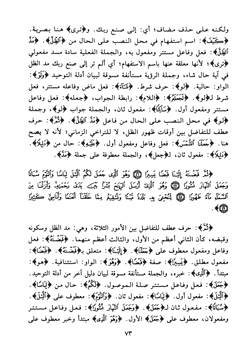 {ثُمَّ}: حرف عطف للتفاضل بين الأمور الثلاثة، وهي: مد الظل وسكونه وقبضه، كأن الثاني أعظم من الأول، والثالث أعظم منهما. {قَبَضْنَاهُ}: فعل وفاعل ومفعول معطوف على {جَعَلْنَا}. {إِلَيْنَا}: متعلق بـ {قَبَضْنَاهُ}. {قَبْضًا}: مفعول مطلق. {يَسِيرًا}: صفة {قَبْضًا}. {وَهُوَ}: الواو: استئنافية. {هو}: مبتدأ. {الَّذِي}: خبره، والجملة مستأنفة مسوقة لبيان دليل آخر من أدلة التوحيد. {جَعَلَ}: فعل وفاعل مستتر صلة الموصول. {لَكُمُ}: حال من {لِبَاسًا}. {اللَّيْلَ}: مفعول أول. {لِبَاسًا}: مفعول ثان. {وَالنَّوْمَ}: معطوف على {اللَّيْلَ}. {سُبَاتًا}: مفعول ثان لـ {جَعَلَ}. {وَجَعَلَ النَّهَارَ نُشُورًا}: فعل وفاعل مستتر ومفعولان، معطوف على {جَعَلَ} الأول. {وَهُوَ الَّذِي} مبتدأ وخبر معطوف على