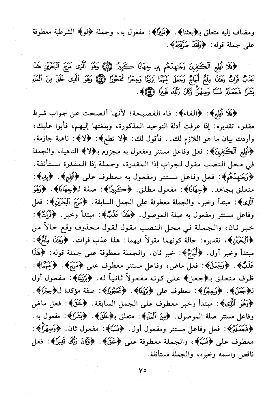 {فَلَا تُطِعِ}: {الفاء}: فاء الفصيحة؛ لأنها أفصحت عن جواب شرط مقدر، تقديره: إذا عرفت أدلة التوحيد المذكورة، وبلغتها إليهم، فأبوا عليك، وأردت بيان ما هو اللازم لك .. فأقول لك: {لا تطع}: {لا}: ناهية جازمة، {تُطِعِ الْكَافِرِينَ}: فعل وفاعل مستتر ومفعول به مجزوم بـ {لا} الناهية، والجملة في محل النصب مقول لجواب إذا المقدرة، وجملة إذا المقدرة مستأنفة. {وَجَاهِدْهُمْ}: فعل وفاعل مستتر ومفعول به معطوف على {تُطِعِ}. {بِهِ}: متعلق بجاهد. {جِهَادًا}: مفعول مطلق. {كَبِيرًا}: صفة لـ {جِهَادًا}. {وَهُوَ الَّذِي}: مبتدأ وخبر، والجملة معطوفة على الجمل السابقة. {مَرَجَ الْبَحْرَيْنِ}: فعل وفاعل مستتر ومفعول به صلة الموصول. {هَذَا عَذْبٌ}: مبتدأ وخبر. {فُرَاتٌ}: خبر ثان، والجملة في محل النصب مقول لقول محذوف وقع حالًا من {الْبَحْرَيْنِ}، تقديره: حالة كونهما مقولًا فيهما: هذا عذب فرات. {وَهَذَا مِلْحٌ}: مبتدأ وخبر أول. {أُجَاجٌ}: خبر ثان، والجملة معطوفة على جملة قوله: {هَذَا عَذْبٌ}. {وَجَعَلَ}: فعل ماض، وفاعل مستتر معطوف على {مَرَجَ}. {بَيْنَهُمَا}: ظرف متعلق بـ {جعل} على كونه مفعولًا ثانيًا له. {بَرْزَخًا}: مفعول أول لـ {جَعَلَ}. {وَحِجْرًا}: معطوف على {بَرْزَخًا}. {مَحْجُورًا}: صفة مؤكدة لـ {حِجْرًا}. {وَهُوَ الَّذِي}: مبتدأ وخبر معطوف على الجمل السابقة. {خَلَقَ}: فعل ماض وفاعل مستتر صلة الموصول. {مِنَ الْمَاءِ}: متعلق بـ {خَلَقَ}. {بَشَرًا}: مفعول به. {فَجَعَلَهُ}: فعل وفاعل مستتر ومفعول أول. {نَسَبًا}: مفعول ثان. {وَصِهْرًا}: معطوف على {نَسَبًا}، والجملة معطوفة على {خَلَقَ}. {وَكَانَ رَبُّكَ قَدِيرًا}: فعل ناقص واسمه وخبره، والجملة مستأنفة.