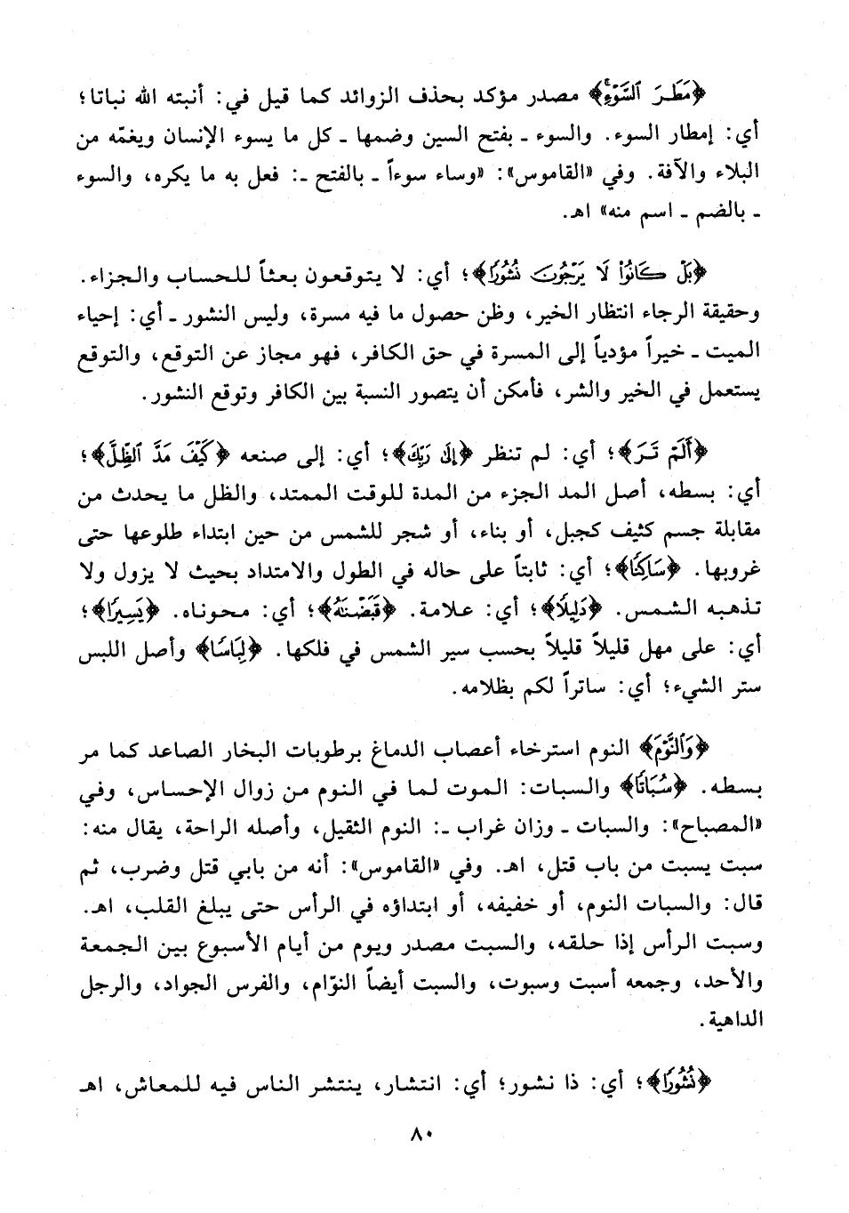 {وَالنَّوْمَ} النوم استرخاء أعصاب الدماغ برطوبات البخار الصاعد كما مر بسطه. {سُبَاتًا} والسبات: الموت لما في النوم من زوال الإحساس، وفي "المصباح": والسبات - وزان غراب -: النوم الثقيل، وأصله الراحة، يقال منه: سبت يسبت من باب قتل، اهـ. وفي "القاموس": أنه من بابي قتل وضرب، ثم قال: والسبات النوم، أو خفيفه، أو ابتداؤه في الرأس حتى يبلغ القلب، اهـ. وسبت الرأس إذا حلقه، والسبت مصدر ويوم من أيام الأسبوع بين الجمعة والأحد، وجمعه أسبت وسبوت، والسبت أيضًا النوّام، والفرس الجواد، والرجل الداهية.