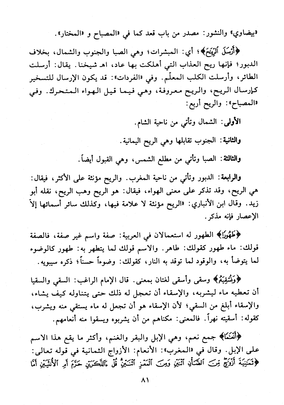 والرابعة: الدبور وتأتي من ناحية المغرب. والريح مؤنثة على الأكثر، فيقال: هي الريح، وقد تذكر على معنى الهواء، فيقال: هو الريح وهب الريح، نقله أبو زيد. وقال ابن الأنباري: "الريح مؤنثة لا علامة فيها، وكذلك سائر أسمائها إلَّا الإعصار فإنه مذكر.
