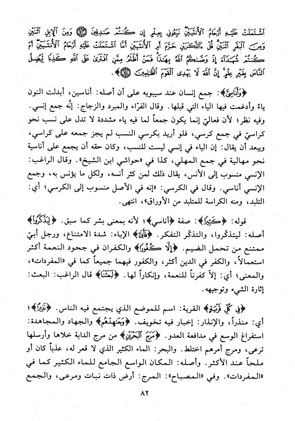 قوله: {كَثِيرًا}: صفة {أناسي}؛ لأنه بمعنى بشر كما سبق. {لِيَذَّكَّرُوا} أصله: ليتذكّروا، والتذكّر التفكر. {فَأَبَى} الإباء: شدة الامتناع، ورجل أبيّ ممتنع من تحمل الضيم. {إِلَّا كُفُورًا} والكفران في جحود النعمة أكثر استعمالًا، والكفر في الدين أكثر، والكفور فيهما جميعًا كما في "المفردات"، والمعنى؛ أي: إلّا كفرنًا للنعمة، وإنكارًا لها. {لَبَعَثْنَا} قال الراغب: البعث: إثارة الشيء وتوجيهه.