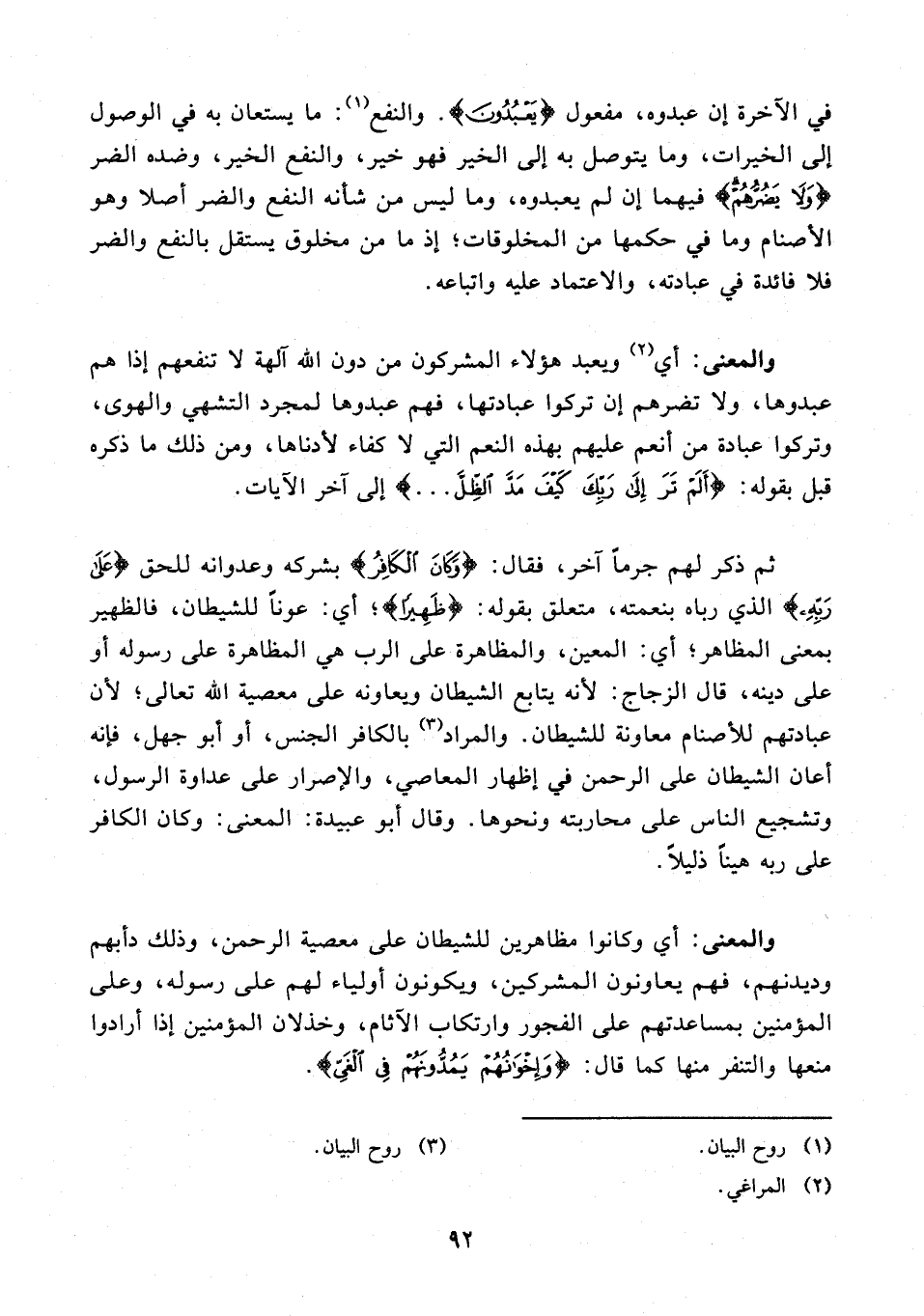 والمعنى: أي (¬2) ويعبد هؤلاء المشركون من دون الله آلهة لا تنفعهم إذا هم عبدوها, ولا تضرهم إن تركوا عبادتها، فهم عبدوها لمجرد التشهي والهوى، وتركوا عبادة من أنعم عليهم بهذه النعم التي لا كفاء لأدناها، ومن ذلك ما ذكره قبل بقوله: {أَلَمْ تَرَ إِلَى رَبِّكَ كَيْفَ مَدَّ الظِّلَّ ...} إلى آخر الآيات.