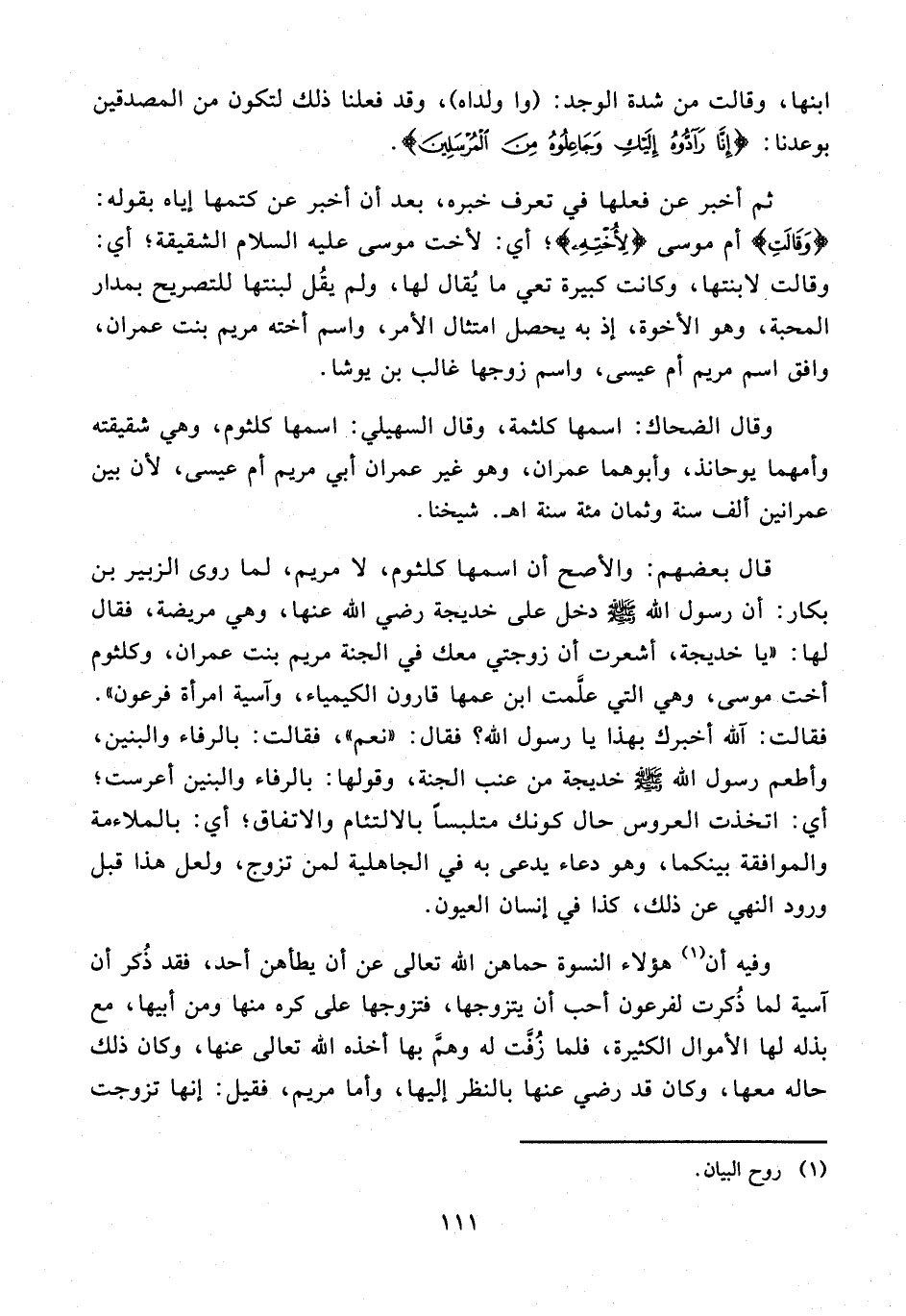 وقال الضحاك: اسمها كلثمة، وقال السهيلي: اسمها كلثوم، وهي شقيقته وأمهما يوحانذ، وأبوهما عمران، وهو غير عمران أبي مريم أم عيسى؛ لأن بين عمرانين ألف سنة وثمان مئة سنة اهـ. شيخنا.