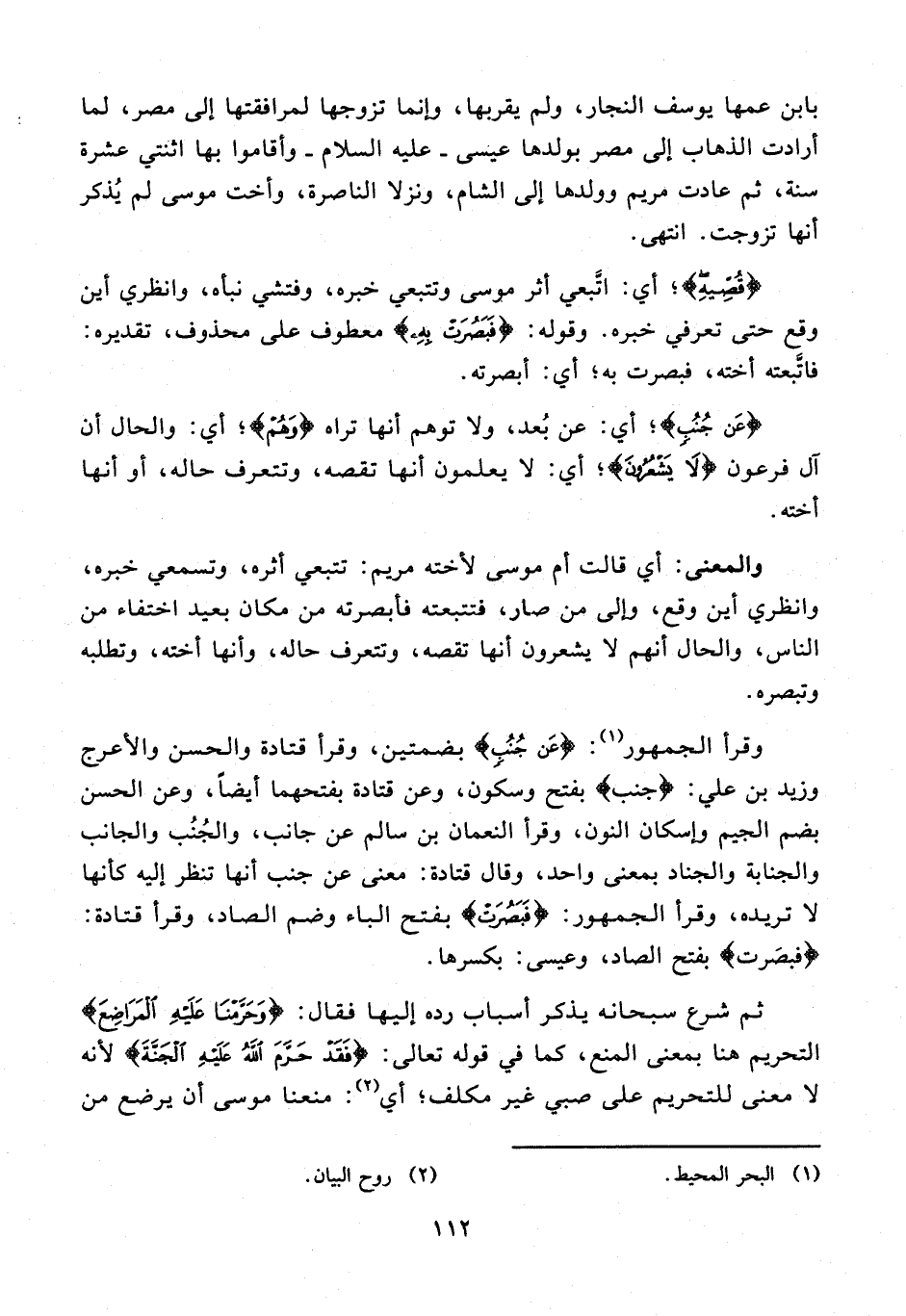 12 - ثم شرع سبحانه يذكر أسباب رده إليها فقال: {وَحَرَّمْنَا عَلَيْهِ الْمَرَاضِعَ} التحريم هنا بمعنى المنع، كما في قوله تعالى: {فَقَدْ حَرَّمَ اللَّهُ عَلَيْهِ الْجَنَّةَ} لأنه لا معنى للتحريم على صبي غير مكلف؛ أي (¬2): منعنا موسى أن يرضع من