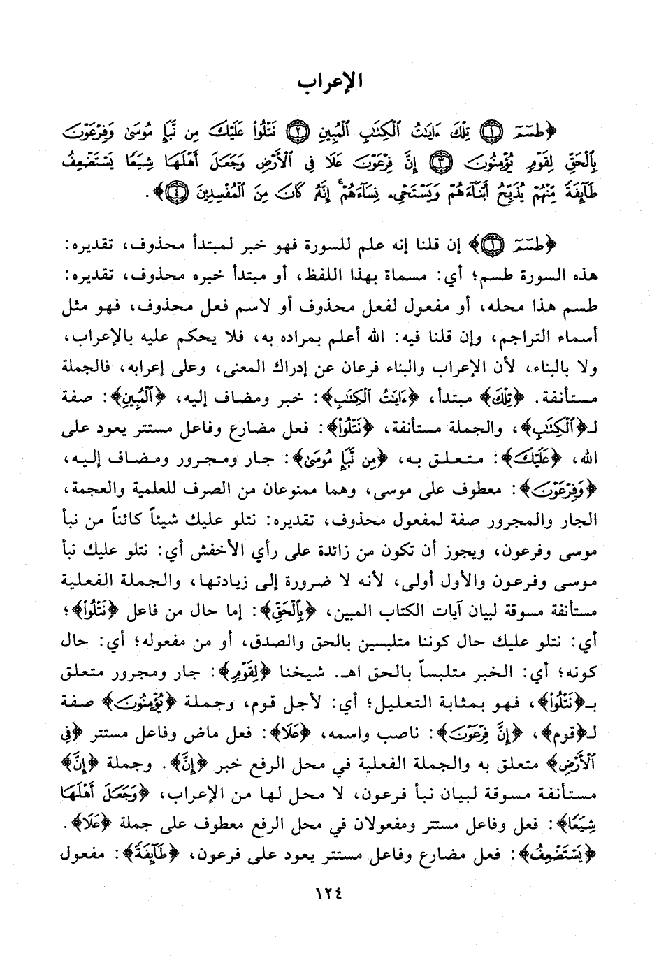{طسم (1)} إن قلنا إنه علم للسورة فهو خبر لمبتدأ محذوف، تقديره: هذه السورة طسم؛ أي: مسماة بهذا اللفظ، أو مبتدأ خبره محذوف، تقديره: طسم هذا محله، أو مفعول لفعل محذوف أو لاسم فعل محذوف، فهو مثل أسماء التراجم، وإن قلنا فيه: الله أعلم بمراده به، فلا يحكم عليه بالإعراب، ولا بالبناء؛ لأن الإعراب والبناء فرعان عن إدراك المعنى، وعلى إعرابه، فالجملة مستأنفة. {تِلْكَ} مبتدأ، {آيَاتُ الْكِتَابِ} خبر ومضاف إليه، {الْمُبِينِ}: صفة لـ {الْكِتَابِ}، والجملة مستأنفة، {نَتْلُو}: فعل مضارع وفاعل مستتر يعود على الله، {عَلَيْكَ}: متعلق به، {مِنْ نَبَإِ مُوسَى} مُوسَى: جار ومجرور ومضاف إليه، {وَفِرْعَوْنَ}: معطوف على موسى، وهما ممنوعان من الصرف للعلمية والعجمة، الجار والمجرور صفة لمفعول محذوف، تقديره: نتلو عليك شيئًا كائنًا من نبأ موسى وفرعون، ويجوز أن تكون من زائدة على رأي الأخفش أي: نتلو عليك نبأ موسى وفرعون والأول أولى؛ لأنه لا ضرورة إلى زيادتها، والجملة الفعلية مستأنفة مسوقة لبيان آيات الكتاب المبين، {بِالْحَقِّ}: إما حال من فاعل {نَتْلُو}؛ أي: نتلو عليك حال كوننا متلبسين بالحق والصدق، أو من مفعوله؛ أي: حال كونه؛ أي: الخير متلبسًا بالحق اهـ. شيخنا {لِقَوْمٍ}: جار ومجرور متعلق بـ {نَتْلُو}، فهو بمثابة التعليل؛ أي: لأجل قوم، وجملة {يُؤْمِنُونَ} صفة لـ {قَوْمٍ}، {إِنَّ فِرْعَوْنَ}: ناصب واسمه، {عَلَا}: فعل ماض وفاعل مستتر {فِي الْأَرْضِ} متعلق به والجملة الفعلية في محل الرفع خبر {إِنَّ}. وجملة {إنَّ} مستأنفة مسوقة لبيان نبأ فرعون، لا محل لها من الإعراب، {وَجَعَلَ أَهْلَهَا شِيَعًا}: فعل وفاعل مستتر ومفعولان في محل الرفع معطوف على جملة {عَلَا}. {يَسْتَضْعِفُ}: فعل مضارع وفاعل مستتر يعود على فرعون، {طَائِفَةً}: مفعول