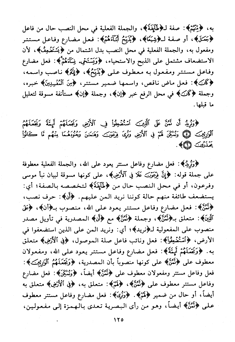 {وَنُرِيدُ}: فعل مضارع وفاعل مستتر يعود على الله، والجله الفعلية معطوفة على جملة قوله: {إِنَّ فِرْعَوْنَ عَلَا فِي الْأَرْضِ}، على كونها مسوقة لبيان نبأ موسى وفرعون، أو في على النصب حال من {طَائِفَةً} لتخصصه بالصفة؛ أي: يستضعف طائفة منهم حالة كوننا نريد المن عليهم. {أن}: حرف نصب، {نَمُنَّ}: فعل مضارع وفاعل مستتر يعود على الله، منصوب بـ {أن}، {عَلَى الَّذِينَ}: متعلق بـ {نَمُنَّ}، وجملة {نَمُنَّ} مع أن المصدرية في تأويل مصدر منصوب على المفعولية لـ {نُرِيدُ}؛ أي: ونريد المن على الذين استضعفوا في الأرض، {اسْتُضْعِفُوا}: فعل ونائب فاعل صلة الموصول، {فِي الْأَرْضِ} متعلق به. {وَنَجْعَلَهُمْ أَئِمَّةً}: فعل مضارع وفاعل مستتر يعود على الله، ومفعولان معطوف على {نَمُنَّ} على كونها منصوبًا بأن المصدرية، {وَنَجْعَلَهُمُ الْوَارِثِينَ}: فعل وفاعل مستتر ومفعولان معطوف على {نَمُنَّ} أيضًا، {وَنُمَكِّنَ}: فعل مضارع وفاعل مستتر معطوف على {نَمُنَّ}، {لَهُمْ}: متعلق به، {فِي الْأَرْضِ} متعلق به أيضًا، أو حال من ضمير {لَهُمْ}. {وَنُرِيَ} فعل مضارع وفاعل مستتر معطوف على {نَمُنَّ} أيضًا، وهو من رأى البصرية تعدى بالهمزة إلى مفعولين،