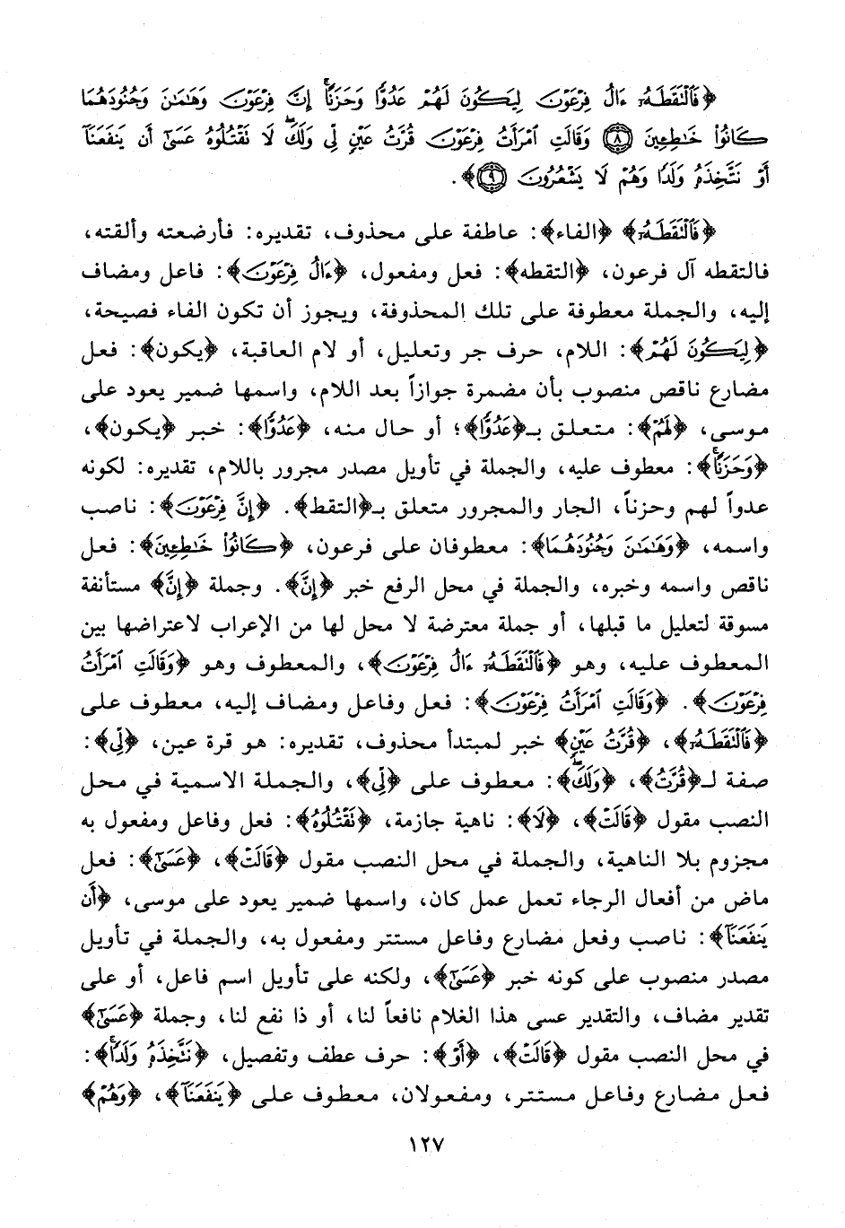 {فَالْتَقَطَهُ} {الفاء}: عاطفة على محذوف، تقديره: فأرضعته وألقته، فالتقطه آل فرعون، {الْتَقَطَهُ}: فعل ومفعول، {آلُ فِرْعَوْنَ}: فاعل ومضاف إليه، والجملة معطوفة على تلك المحذوفة، ويجوز أن تكون الفاء فصيحة، {لِيَكُونَ لَهُمْ}: اللام، حرف جر وتعليل، أو لام العاقبة، {يَكُونَ}: فعل مضارع ناقص منصوب بأن مضمرة جوازًا بعد اللام، واسمها ضمير يعود على موسي، {لَهُمْ}: متعلق بـ {عَدُوًّا}؛ أو حال منه، {عَدُوًّا}: خبر {يَكُونَ}، {وَحَزَنًا}: معطوف عليه، والجملة في تأويل مصدر مجرور باللام، تقديره: لكونه عدوًا لهم وحزنًا، الجار والمجرور متعلق بـ {الْتَقَطَ}. {إِنَّ فِرْعَوْنَ}: ناصب واسمه، {وَهَامَانَ وَجُنُودَهُمَا}: معطوفان على فرعون، {كَانُوا خَاطِئِينَ}: فعل ناقص واسمه وخبره، والجملة في محل الرفع خبر {إِنَّ}. وجملة {إنَّ} مستأنفة مسوقة لتعليل ما قبلها، أو جملة معترضة لا محل لها من الإعراب لاعتراضها بين المعطوف عليه، وهو {فَالْتَقَطَهُ آلُ فِرْعَوْنَ لِيَكُونَ}، والمعطوف وهو {وَقَالَتِ امْرَأَتُ فِرْعَوْنَ}. {وَقَالَتِ امْرَأَتُ فِرْعَوْنَ}: فعل وفاعل ومضاف إليه، معطوف على {فَالْتَقَطَهُ}، {قُرَّتُ عَيْنٍ} خبر لمبتدأ محذوف، تقديره: هو قرة عين، {لِي}: صفة لـ {قُرَّتُ}، {وَلَكَ}: معطوف على {لِي}، والجملة الاسمية في محل النصب مقول {قَالَتِ}، {لَا}: ناهية جازمة، {تَقْتُلُوهُ}: فعل وفاعل ومفعول به مجزوم بلا الناهية، والجملة في محل النصب مقول {وَقَالَتِ}، {عَسَى}: فعل ماض من أفعال الرجاء تعمل عمل كان، واسمها ضمير يعود على موسى، {أَنْ يَنْفَعَنَا}: ناصب وفعل مضارع وفاعل مستتر ومفعول به، والجملة في تأويل مصدر منصوب على كونه خبر {عَسَى}، ولكنه على تأويل اسم فاعل، أو على تقدير مضاف، والتقدير عسى هذا الغلام نافعًا لنا، أو ذا نفع لنا، وجملة {عَسَى} في محل النصب مقول {قَالَتِ}، {أَوْ}: حرف عطف وتفصيل، {نَتَّخِذَهُ وَلَدًا}: فعل مضارع وفاعل مستتر، ومفعولان، معطوف على {يَنْفَعَنَا}، {وَهُمْ}