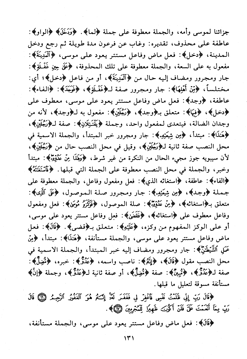 جزائنا لموسى وأمه، والجملة معطوفة على جملة {لَمَّا}. {وَدَخَلَ} {الواو}: عاطفة على محذوف، تقديره: وغاب عن فرعون مدة طويلة ثم رجع ودخل المدينة، {دَخَلَ}: فعل ماض وفاعل مستتر يعود على موسى، {الْمَدِينَةَ}: مفعول به على السعة، والجملة معطوفة على تلك المحذوفة، {عَلَى حِينِ غَفْلَةٍ}: جار ومجرور ومضاف إليه حال من {الْمَدِينَةَ} أو من فاعل {دَخَلَ}؛ أي: مختلسًا، {مِنْ أَهْلِهَا}: جار ومجرور صفة لـ {غَفْلَةٍ}، {فَوَجَدَ}: {الفاء}: عاطفة، {وَجَدَ}: فعل ماض وفاعل مستتر يعود على موسى، معطوف على {دَخَلَ}، {فِيهَا}: متعلق بـ {وَجَدَ}، {رَجُلَيْنِ}: مفعول به لـ {وَجَدَ}؛ لأنه من وجدان الضالة، فيتعدى لمفعول واحد، وجملة {يَقْتَتِلَانِ}: صفة لـ {رَجُلَيْنِ}، {هَذَا}: مبتدأ، {مِنْ شِيعَتِهِ}: جار ومجرور خبر المبتدأ، والجملة الاسمية في محل النصب صفة ثانية لـ {رَجُلَيْنِ}، وقيل في محل النصب حال من {رَجُلَيْنِ}، لأن سيبويه جوز مجيء الحال من النكرة من غير شرط، {وَهَذَا مِنْ عَدُوِّهِ}: مبتدأ وخبر، والجملة في محل النصب معطوفة على الجملة التي قبلها. {فَاسْتَغَاثَهُ} {الفاء}: عاطفة، {اسْتَغَاثَهُ الَّذِي}: فعل ومفعول وفاعل، والجملة معطوفة على جملة {وَجَدَ}، {مِنْ شِيعَتِهِ}: جار ومجرور صلة الموصول، {عَلَى الَّذِي}: متعلق بـ {اسْتَغَاثَهُ}، {مِنْ عَدُوِّهِ}: صلة الموصول، {فَوَكَزَهُ مُوسَى}: فعل ومفعول وفاعل معطوف على {اسْتَغَاثَه}، {فَقَضَى}: فعل وفاعل مستتر يعود على موسى، أو على الوكز المفهوم من وكزه، {عَلَيْهِ}: متعلق بـ {فَقَضَى}. {قَالَ}: فعل ماض وفاعل مستتر يعود على موسى، والجملة مستأنفة، {هَذَا}: مبتدأ، {مِنْ عَمَلِ الشَّيْطَانِ}: جار ومجرور ومضاف إليه خبر المبتدأ، والجملة الاسمية في محل النصب مقول {قَالَ}، {إِنَّهُ}: ناصب واسمه، {عَدُوٌّ}: خبره، {مُضِلٌّ}: صفة لـ {عَدُوٌّ}، {مُبِينٌ}: صفة {مُضِلٌّ}، أو صفة ثانية لـ {عَدُوٌّ}، وجملة {إنَّ} مستأنفة مسوقة لتعليل ما قبلها.