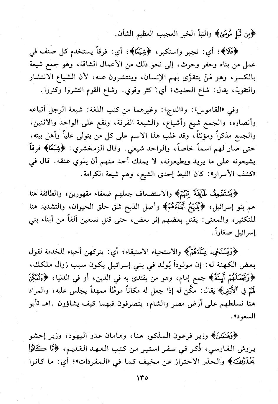 {عَلَا}؛ أي: تجبر واستكبر، {شِيَعًا}؛ أي: فرقًا يستخدم كل صنف في عمل من بناء وحفر وحرث، إلى نحو ذلك من الأعمال الشاقة، وهو جمع شيعة بالكسر، وهو مَنْ يتقوَّى بهم الإنسان، وينتشرون عنه, لأن الشياع الانتشار والتقوية، يقال: شاع الحديث؛ أي: كثر وقوي. وشاع القوم انتشروا وكثروا.