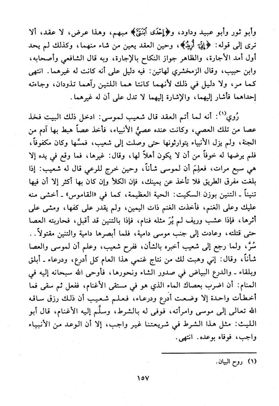 رُوي (¬1): أنه لما أتم العقد قال شعيب لموسى: ادخل ذلك البيت فخذ عصا من تلك العصي، وكانت عنده عصيُّ الأنبياء، فأخذ عصًا هبط بها آدم من الجنة، ولم يزل الأنبياء يتوارثونها حتى وصلت إلى شعيب، فمسَّها وكان مكفوفًا، فلم يرضها له خوفًا من أن لا يكون أهلًا لها، وقال: غيرها، فما وقع في يده إلا هي سبع مرات، فعلِمَ أن لموسى شأنًا، وحين خرج للرعي قال له شعيب: إذا بلغت مفرق الطريق فلا تأخذ عن يمينك، فإن الكلأ وإن كان بها أكثر إلا أن فيها تنينًا - التنين بوزن السكيت: الحية العظيمة، كما في "القاموس" - أخشى منه عليك وعلى الغنم، فأخذت الغنم ذات اليمين، ولم يقدر على كفها، ومشى على أثرها، فإذا عشب وريف لم يُرَ مثله فنام، فإذا بالتنين قد أقبل، فحاربته العصا حتى قتلته، وعادت إلى جنب موسى دامية، فلما أبصرها دامية والتنين مقتولًا .. سُرَّ، ولما رجع إلى شعيب أخبره بالشأن، ففرح شعيب، وعلم أن لموسى والعصا شأنًا، وقال: إني وهبت لك من نتاج غنمي هذا العام كل أدرع، ودرعاء - أبلق وبلقاء - والدرع البياض في صدور الشاء ونحورها، فأوحى الله سبحانه إليه في المنام: أن اضرب بعصاك الماء الذي هو في مستقى الأغنام، ففعل ثم سقى فما أخطأت واحدة إلا وضعت أدرع ودرعاء، فعلم شعيب أن ذلك رزق ساقه الله تعالى إلى موسى وامرأته، فوفى له بالشرط، وسلَّم إليه الأغنام، قال أبو الليث: مثل هذا الشرط في شريعتنا غير واجب، إلا أن الوعد من الأنبياء واجب، فوفاه بوعده. انتهى.
