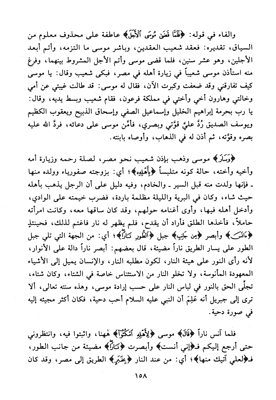 29 - والفاء في قوله: {فَلَمَّا قَضَى مُوسَى الْأَجَلَ} عاطفة على محذوف معلوم من السياق، تقديره: فعقد شعيب العقدين، وباشر موسى ما التزمه، وأتم أبعد الأجلين، وهو عشر سنين، فلما قضى موسى وأتم الأجل المشروط بينهما، وفرغ منه استأذن موسى شعيبًا في زيارة أهله في مصر، فبكى شعيب وقال: يا موسى كيف تفارقني وقد ضعفت وكبرت الآن، فقال له موسى: قد طالت غيبتي عن أمي وخالتي وهارون أخي وأختي في مملكة فرعون، فقام شعيب وبسط يديه، وقال: يا رب بحرمة إبراهيم الخليل وإسماعيل الصفي وإسحاق الذبيح ويعقوب الكظيم ويوسف الصديق رُدَّ عليَّ قوَّتي وبصري، فأمَّن موسى على دعائه، فردَّ الله عليه بصره وقوَّته، ثم أذن له في الذهاب، وأوصاه بابنته.
