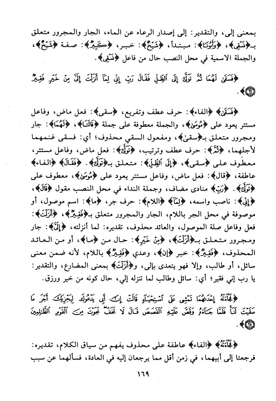 {فَسَقَى} {الفاء}: حرف عطف وتفريع، {سقى}: فعل ماض، وفاعل مستتر يعود على {مُوسَى}، والجملة معطوفة على جملة {قَالَتَا}، {لَهُمَا}: جار ومجرور متعلق بـ {سقى}، ومفعول السقي محذوف؛ أي: فسقى غنمهما لأجلهما، {ثُمَّ}: حرف عطف وترتيب، {تَوَلَّى}: فعل ماض، وفاعل مستتر، معطوف على {سقى}، {إِلَى الظِّلِّ}: متعلق بـ {تَوَلَّى}. {فَقَالَ} {الفاء} عاطفة، {قال}: فعل ماض، وفاعل مستتر يعود على {مُوسَى}، معطوف على {تَوَلَّى}. {رَبِّ} منادى مضاف، وجملة النداء في محل النصب مقول {قَالَ}، {إِنِّي}: ناصب واسمه، {لِمَا} {اللام}: حرف جر، {ما}: اسم موصول، أو موصوفة في محل الجر باللام، الجار والمجرور متعلق بـ {فَقِيرٌ}، {أَنْزَلْتَ}: فعل وفاعل صلة الموصول، والعائد محذوف، تقديره: لما أنزلته، {إِلَيَّ}: جار ومجرور متعلق بـ {أَنْزَلْتَ}، {مِنْ خَيْرٍ}: حال من {ما}، أو من العائد المحذوف، {فَقِيرٌ}: خبر {إن}، وعدي {فَقِيرٌ} باللام, لأنه ضمن معنى سائل، أو طالب، وإلا فهو يتعدى بإلى، و {أَنْزَلْتَ} بمعنى المضارع، والتقدير: يا رب إني فقير؛ أي: سائل وطالب لما تنزله إلى، حال كونه من خير ورزق.