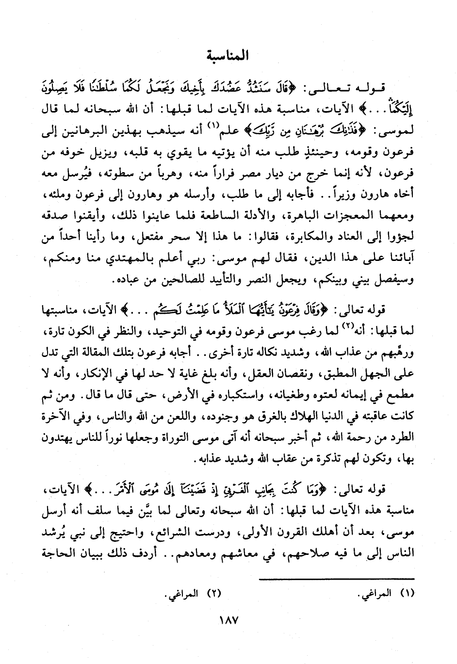 قوله تعالى: {قَالَ سَنَشُدُّ عَضُدَكَ بِأَخِيكَ وَنَجْعَلُ لَكُمَا سُلْطَانًا فَلَا يَصِلُونَ إِلَيْكُمَا ...} الآيات، مناسبة هذه الآيات لما قبلها: أن الله سبحانه لما قال لموسى: {فَذَانِكَ بُرْهَانَانِ مِنْ رَبِّكَ} علم (¬1) أنه سيذهب بهذين البرهانين إلى فرعون وقومه، وحينئذٍ طلب منه أن يؤتيه ما يقوي به قلبه، ويزيل خوفه من فرعون, لأنه إنما خرج من ديار مصر فرارًا منه، وهربًا من سطوته، فيُرسل معه أخاه هارون وزيرًا .. فأجابه إلى ما طلب، وأرسله هو وهارون إلى فرعون وملئه، ومعهما المعجزات الباهرة، والأدلة الساطعة فلما عاينوا ذلك، وأيقنوا صدقه لجؤوا إلى العناد والمكابرة، فقالوا: ما هذا إلا سحر مفتعل، وما رأينا أحدًا من آبائنا على هذا الدين، فقال لهم موسى: ربي أعلم بالمهتدي منا ومنكم، وسيفصل بيني وبينكم، ويجعل النصر والتأييد للصالحين من عباده.