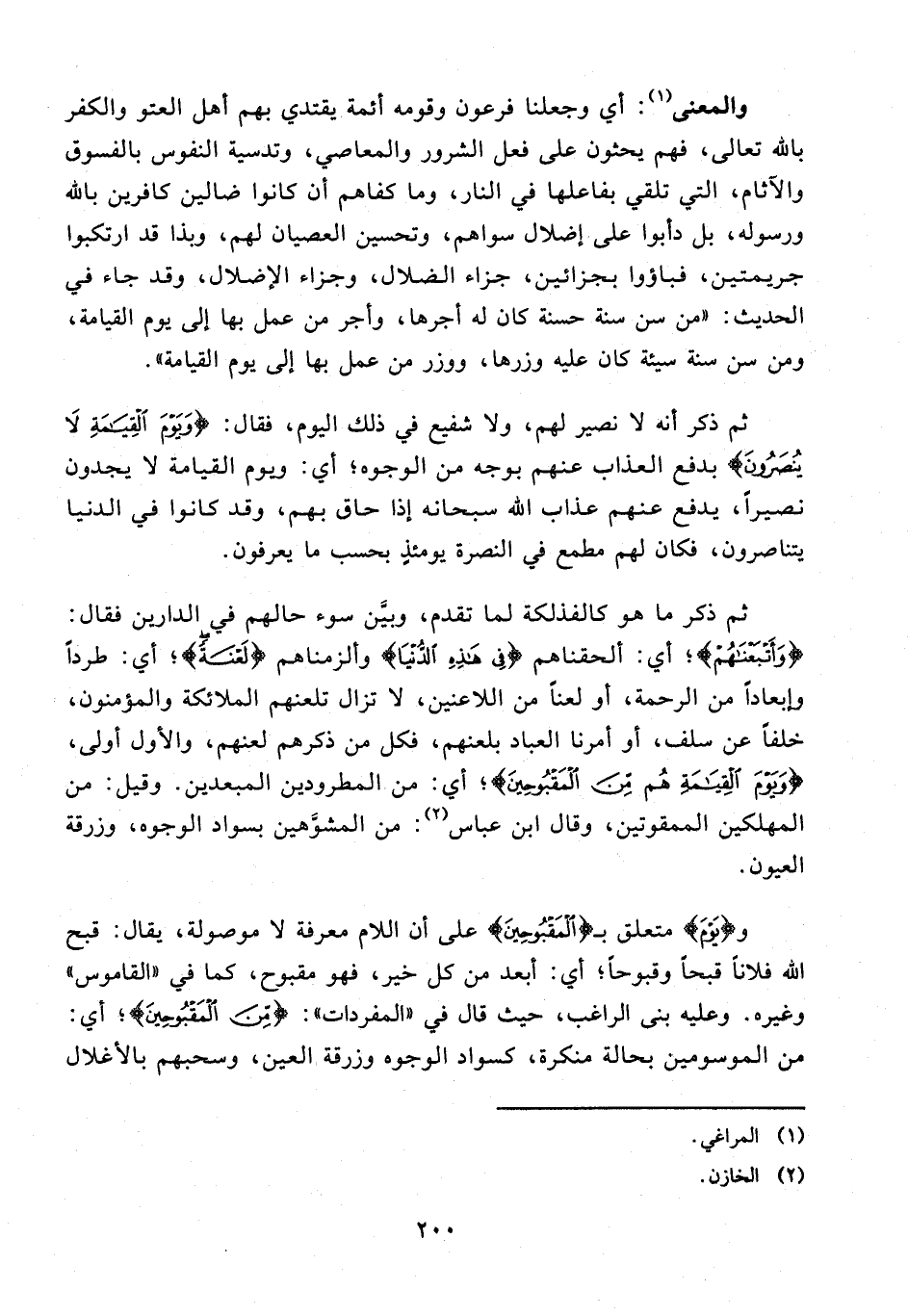 42 - ثم ذكر ما هو كالفذلكة لما تقدم، وبيَّن سوء حالهم في الدارين فقال: {وَأَتْبَعْنَاهُمْ}؛ أي: ألحقناهم {فِي هَذِهِ الدُّنْيَا} وألزمناهم {لَعْنَةً}؛ أي: طردًا وإبعادًا من الرحمة، أو لعنًا من اللاعنين، لا تزال تلعنهم الملائكة والمؤمنون، خلفًا عن سلف، أو أمرنا العباد بلعنهم، فكل من ذكرهم لعنهم، والأول أولى، {وَيَوْمَ الْقِيَامَةِ هُمْ مِنَ الْمَقْبُوحِينَ}؛ أي: من المطرودين المبعدين. وقيل: من المهلكين الممقوتين، وقال ابن عباس (¬2): من المشوَّهين بسواد الوجوه، وزرقة العيون.