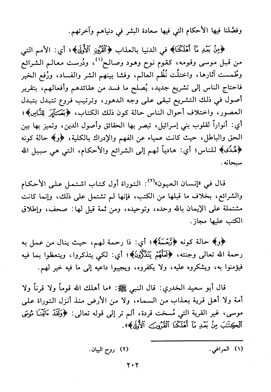 قال أبو سعيد الخدري: قال النبي - صلى الله عليه وسلم -: "ما أهلك الله قومًا ولا قرنًا ولا أمة ولا أهل قرية بعذاب من السماء، ولا من الأرض منذ أنزل التوراة على موسى، غير القرية التي مُسخت قردة، ألم تر إلى قوله تعالى: {وَلَقَدْ آتَيْنَا مُوسَى الْكِتَابَ مِنْ بَعْدِ مَا أَهْلَكْنَا الْقُرُونَ الْأُولَى} ".