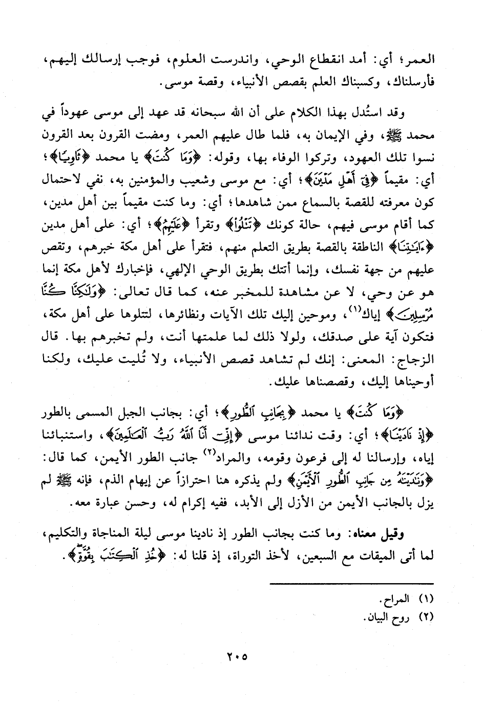 46 - {وَمَا كُنْتَ} يا محمد {بِجَانِبِ الطُّور}؛ أي: بجانب الجبل المسمى بالطور {إِذْ نَادَيْنَا}؛ أي: وقت ندائنا موسى {إِنِّي أَنَا اللَّهُ رَبُّ الْعَالَمِينَ}، واستنبائنا إياه، وإرسالنا له إلى فرعون وقومه، والمراد (¬2) جانب الطور الأيمن، كما قال: {وَنَادَيْنَاهُ مِنْ جَانِبِ الطُّورِ الْأَيْمَنِ} ولم يذكره هنا احترازًا عن إيهام الذم، فإنه - صلى الله عليه وسلم - لم يزل بالجانب الأيمن من الأزل إلى الأبد، ففيه إكرام له، وحسن عبارة معه.