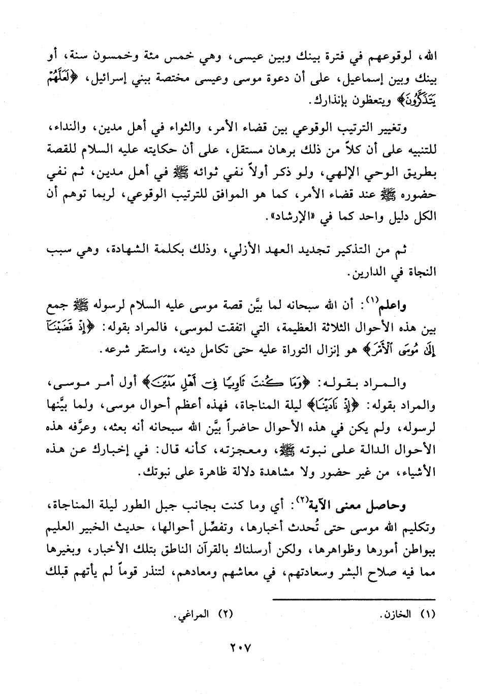وحاصل معنى الآية (¬2): أي وما كنت بجانب جبل الطور ليلة المناجاة، وتكليم الله موسى حتى تُحدث أخبارها، وتفصِّل أحوالها، حديث الخبير العليم ببواطن أمورها وظواهرها, ولكن أرسلناك بالقرآن الناطق بتلك الأخبار، وبغيرها مما فيه صلاح البشر وسعادتهم، في معاشهم ومعادهم، لتنذر قومًا لم يأتهم قبلك