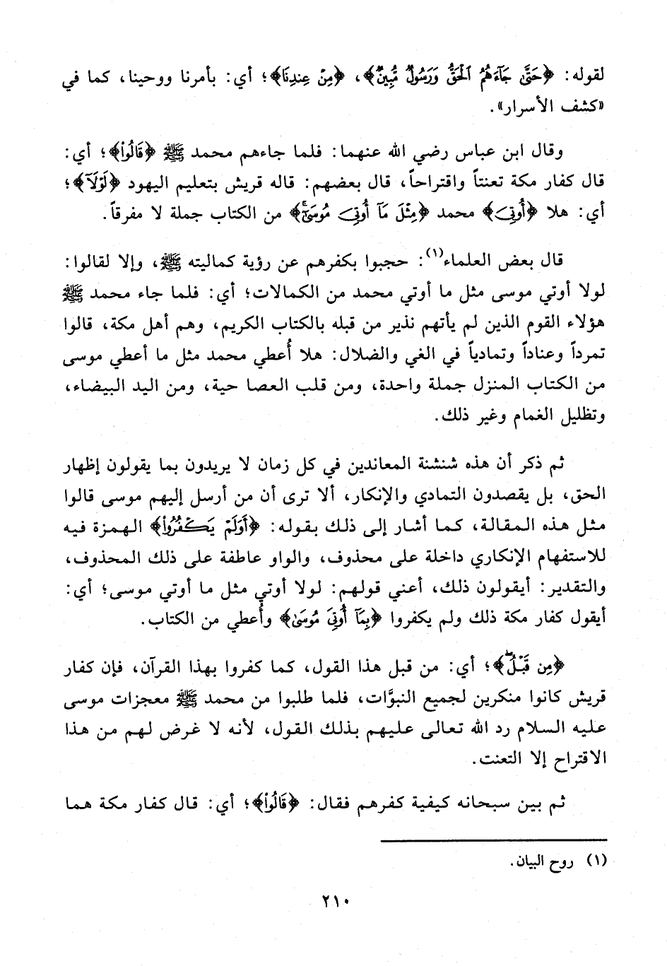 قال بعض العلماء (¬1): حجبوا بكفرهم عن رؤية كماليته - صلى الله عليه وسلم -، وإلا لقالوا: لولا أوتي موسى مثل ما أوتي محمد من الكمالات؛ أي: فلما جاء محمد - صلى الله عليه وسلم - هؤلاء القوم الذين لم يأتهم نذير من قبله بالكتاب الكريم، وهم أهل مكة، قالوا تمردًا وعنادًا وتماديًا في الغي والضلال: هلا أُعطي محمد مثل ما أعطي موسى من الكتاب المنزل جملة واحدة، ومن قلب العصا حية، ومن اليد البيضاء، وتظليل الغمام وغير ذلك.
