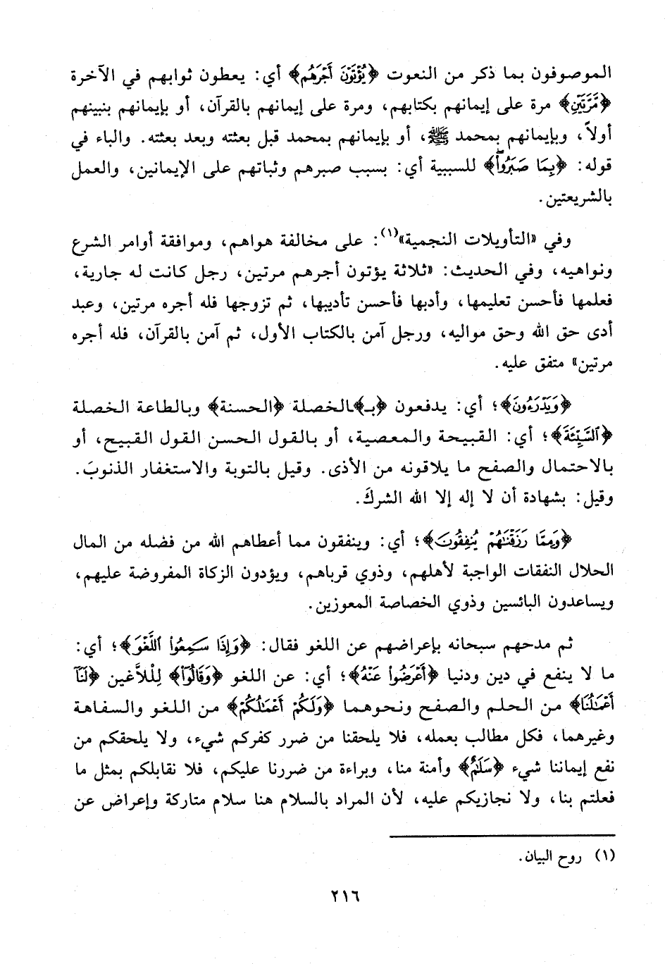 وفي "التأويلات النجمية" (¬1): على مخالفة هواهم، وموافقة أوامر الشرع ونواهيه، وفي الحديث: "ثلاثة يؤتون أجرهم مرتين، رجل كانت له جارية، فعلمها فأحسن تعليمها، وأدبها فأحسن تأديبها، ثم تزوجها فله أجره مرتين، وعبد أدى حق الله وحق مواليه، ورجل آمن بالكتاب الأول، ثم آمن بالقرآن، فله أجره مرتين" متفق عليه.