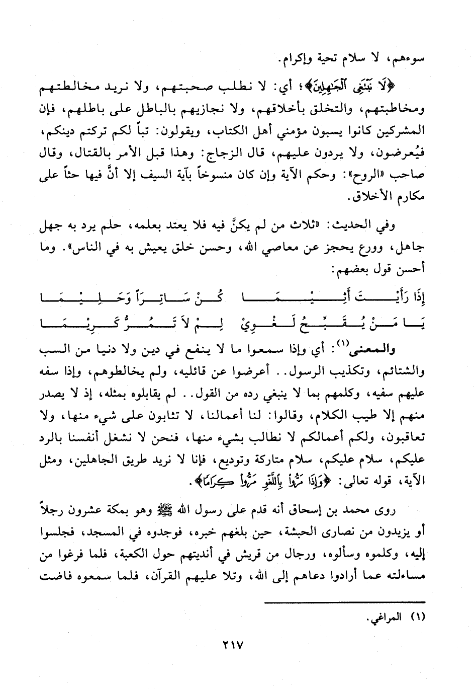 {لَا نَبْتَغِي الْجَاهِلِينَ}؛ أي: لا نطلب صحبتهم، ولا نريد مخالطتهم ومخاطبتهم، والتخلق بأخلاقهم، ولا نجازيهم بالباطل على باطلهم، فإن المشركين كانوا يسبون مؤمني أهل الكتاب، ويقولون: تبًا لكم تركتم دينكم، فيُعرضون، ولا يردون عليهم، قال الزجاج: وهذا قبل الأمر بالقتال، وقال صاحب "الروح": وحكم الآية وإن كان منسوخًا بآية السيف إلا أنَّ فيها حثًا على مكارم الأخلاق.