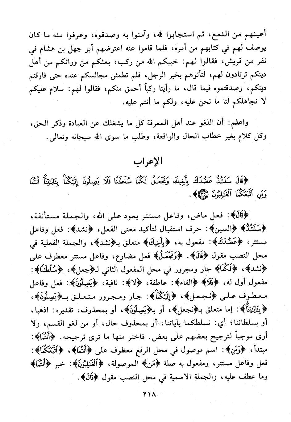 {قَالَ}: فعل ماض، وفاعل مستتر يعود على الله، والجملة مستأنفة، {سَنَشُدّ} {السين}: حرف استقبال لتأكيد معنى الفعل، {نشد}: فعل وفاعل مستتر، {عَضُدَكَ}: مفعول به، {بِأَخِيكَ} متعلق بـ {نشد}، والجملة الفعلية في محل النصب مقول {قَالَ}. {وَنَجْعَلُ} فعل مضارع، وفاعل مستتر معطوف على {نشد}، {لَكُمَا} جار ومجرور في محل المفعول الثاني لـ {جعل}، {سُلْطَانًا}: مفعول أول له، {فَلَا} {الفاء}: عاطفة، {لا}: نافية، {يَصِلُونَ}: فعل وفاعل معطوت على {نجعل}، {إِلَيْكُمَا}: جار ومجرور متعلق بـ {يَصِلُونَ}، {بِآيَاتِنَا}: إما متعلق بـ {نجعل}، أو بـ {يَصِلُونَ}، أو بمحذوف، تقديره: اذهبا، أو بسلطاننا؛ أي: نسلطكما بآياتنا، أو بمحذوف حال، أو من لغو القسم، ولا أرى موجبًا لترجيح بعضهم على بعض. فاختر منها ما ترى ترجيحه. {أَنْتُمَا}: مبتدأ، {وَمَنِ}: اسم موصول في محل الرفع معطوف على {أَنْتُمَا}، {اتَّبَعَكُمَا}: فعل وفاعل مستتر، ومفعول به صلة {مَن} الموصولة، {الْغَالِبُونَ}: خبر {أَنْتُمَا} وما عطف عليه، والجملة الاسمية في محل النصب مقول {قَالَ}.