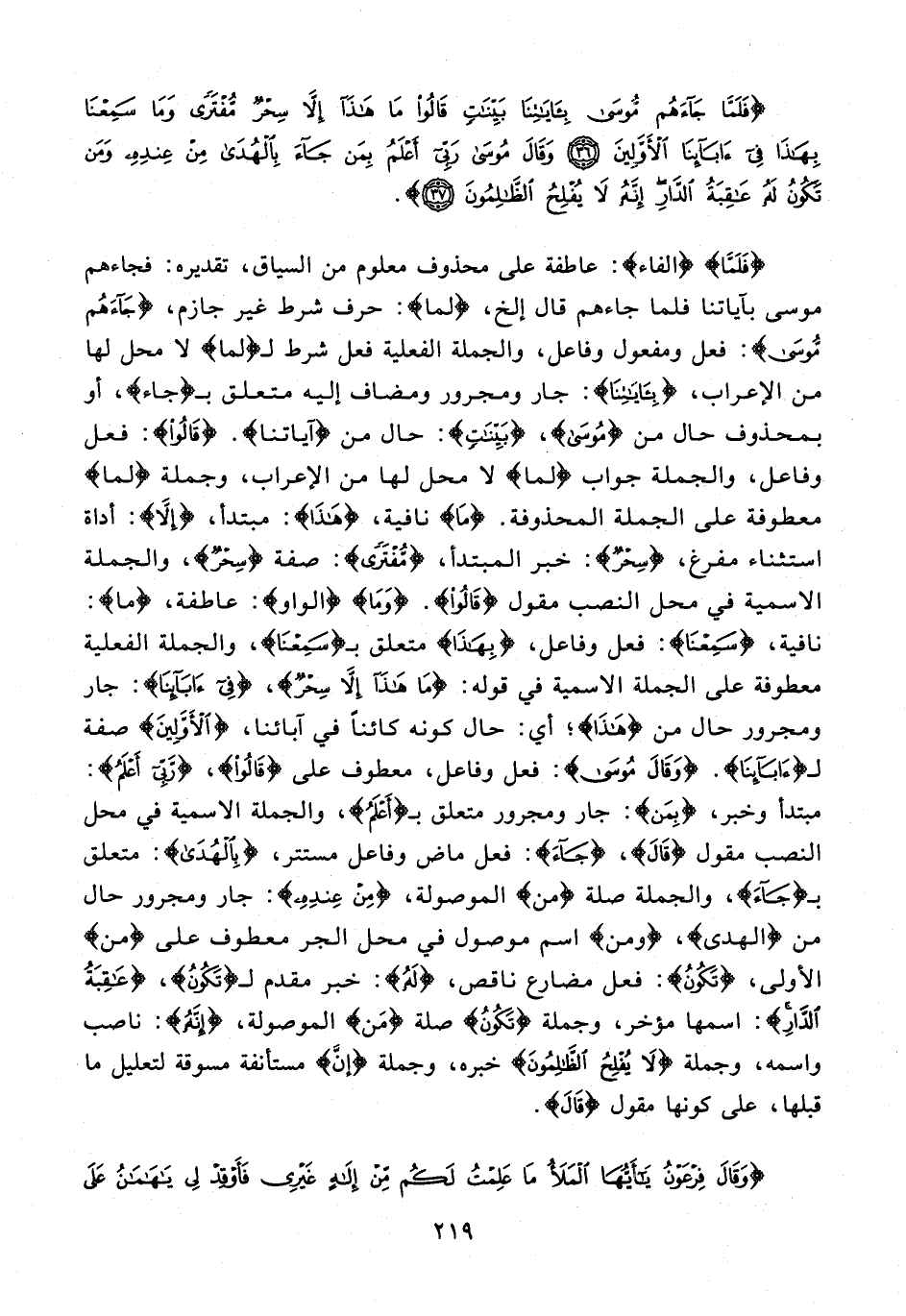 {فَلَمَّا} {الفاء}: عاطفة على محذوف معلوم من السياق، تقديره: فجاءهم موسى بآياتنا فلما جاءهم قال إلخ، {لما}: حرف شرط غير جازم، {جَاءَهُمْ مُوسَى}: فعل ومفعول وفاعل، والجملة الفعلية فعل شرط لـ {لما} لا محل لها من الإعراب، {بِآيَاتِنَا}: جار ومجرور ومضاف إليه متعلق بـ {جاء}، أو بمحذوف حال من {مُوسَى}، {بَيِّنَاتٍ}: حال من {آياتنا}. {قَالُوا}: فعل وفاعل، والجملة جواب {لما} لا محل لها من الإعراب، وجملة {لما} معطوفة على الجملة المحذوفة. {مَا} نافية، {هَذَا}: مبتدأ، {إِلَّا}: أداة استثناء مفرغ، {سِحْرٌ}: خبر المبتدأ، {مُفْتَرًى}: صفة {سِحْرٌ}، والجملة الاسمية في محل النصب مقول {قَالُوا}. {وَمَا} {الواو}: عاطفة، {ما}: نافية، {سَمِعْنَا}: فعل وفاعل، {بِهَذَا} متعلق بـ {سَمِعْنَا}، والجملة الفعلية معطوفة على الجملة الاسمية في قوله: {مَا هَذَا إِلَّا سِحْرٌ}، {فِي آبَائِنَا}: جار ومجرور حال من {هَذَا}؛ أي: حال كونه كائنًا في آبائنا، {الْأَوَّلِينَ} صفة لـ {آبَائِنَا}. {وَقَالَ مُوسَى}: فعل وفاعل، معطوف على {قَالُوا}، {رَبِّي أَعْلَمُ}: مبتدأ وخبر، {بِمَنْ}: جار ومجرور متعلق بـ {أَعْلَمُ}، والجملة الاسمية في محل النصب مقول (قَالَ)، {جَاءَ}: فعل ماض وفاعل مستتر، {بِالْهُدَى}: متعلق بـ {جَاءَ}، والجملة صلة {من} الموصولة، {مِنْ عِنْدِهِ}: جار ومجرور حال من {الهدى}، {وَمَنْ} اسم موصول في محل الجر معطوف على {من} الأولى، {تَكُونُ}: فعل مضارع ناقص، {لَهُ}: خبر مقدم لـ {تَكُونُ}، {عَاقِبَةُ الدَّارِ}: اسمها مؤخر، وجملة {تَكُونُ} صلة {مَن} الموصولة، {إِنَّهُ}: ناصب واسمه، وجملة {لَا يُفْلِحُ الظَّالِمُونَ} خبره، وجملة {إنَّ} مستأنفة مسوقة لتعليل ما قبلها، على كونها مقول {قَالَ}.