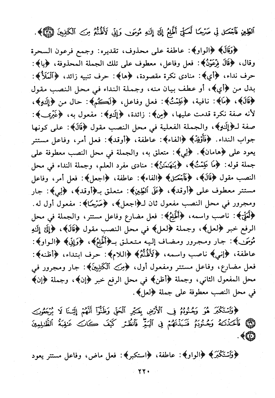 {وَقَالَ} {الواو}: عاطفة على محذوف، تقديره: وجمع فرعون السحرة وقال، {قَالَ فِرْعَوْنُ}: فعل وفاعل، معطوف على تلك الجملة المحذوفة، {يا}: حرف نداء، {أي}: منادى نكرة مقصودة، {ها}: حرف تنبيه زائد، {الْمَلَأُ}: بدل من {أي}، أو عطف بيان منه، وجملة النداء في محل النصب مقول {قَالَ}، {ما}: نافية، {عَلِمْتُ}: فعل وفاعل، {لَكُمْ}: حال من {إِلَهٍ}، لأنه صفة نكرة قدمت عليها، {مِنْ}: زائدة، {إِلَهٍ}: مفعول به، {غَيْرِي}: صفة لـ {إِلَهٍ}، والجملة الفعلية في محل النصب مقول {قَالَ}: على كونها جواب النداء. {فَأَوْقِدْ} {الفاء}: عاطفة، {أوقد}: فعل أمر، وفاعل مستتر يعود على {هَامَانُ}. {لِي}: متعلق به، والجملة في محل النصب معطوفة على جملة قوله: {مَا عَلِمْتُ}، {يَا هَامَانُ}: منادى مفرد العلم، وجملة النداء في محل النصب مقول {قَالَ}، {فَاجْعَلْ} {الفاء}: عاطفة، {اجعل}: فعل أمر، وفاعل مستتر معطوف على {أوقد}، {عَلَى الطِّينِ}: متعلق بـ {أَوْقِدْ}، {لِي}: جار ومجرور في محل النصب مفعول ثان لـ {اجعل}، {صَرْحًا}: مفعول أول له. {لَعَلِّي}: ناصب واسمه، {أَطَّلِعُ}: فعل مضارع وفاعل مستتر، والجملة في محل الرفع خبر {لعل}، وجملة {لعل} في محل النصب مقول {قَالَ}، {إِلَى إِلَهِ مُوسَى}: جار ومجرور ومضاف إليه متعلق بـ {أَطَّلِعُ}؛ {وَإِنِّي} {الواو}: عاطفة، {إني} ناصب واسمه، {لَأَظُنُّهُ} {اللام}: حرف ابتداء، {أظنه}: فعل مضارع، وفاعل مستتر ومفعول أول، {مِنَ الْكَاذِبِينَ}: جار ومجرور في محل المفعول الثاني، وجملة {أظن} في محل الرفع خبر {إن}، وجملة {إن} في محل النصب معطوفة على جملة {لعل}.