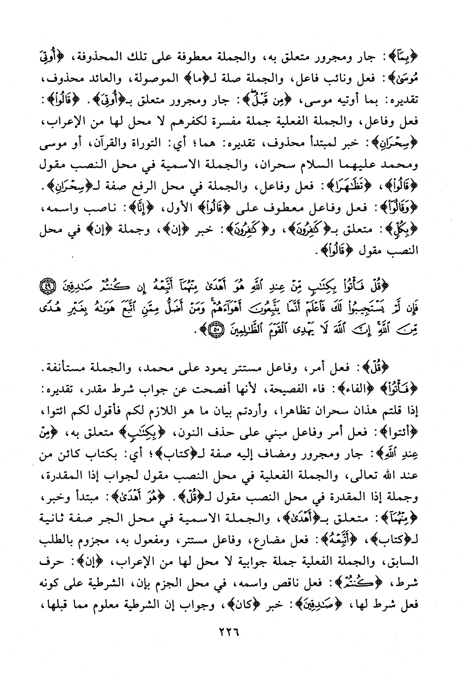 {قُلْ}: فعل أمر، وفاعل مستتر يعود على محمد، والجملة مستأنفة. {فَأْتُوا} {الفاء}: فاء الفصيحة, لأنها أفصحت عن جواب شرط مقدر، تقديره: إذا قلتم هذان سحران تظاهرا، وأردتم بيان ما هو اللازم لكم فأقول لكم ائتوا، {أئتوا}: فعل أمر وفاعل مبني على حذف النون، {بِكِتَابٍ} متعلق به، {مِنْ عِنْدِ اللَّهِ}: جار ومجرور ومضاف إليه صفة لـ {كتاب}؛ أي: بكتاب كائن من عند الله تعالى، والجملة الفعلية في محل النصب مقول لجواب إذا المقدرة، وجملة إذا المقدرة في محل النصب مقول لـ {قُلْ}. {هُوَ أَهْدَى}: مبتدأ وخبر، {مِنْهُمَا}: متعلق بـ {أَهْدَى}، والجملة الاسمية في محل الجر صفة ثانية لـ {كتاب}، {أَتَّبِعْهُ}: فعل مضارع، وفاعل مستتر، ومفعول به، مجزوم بالطلب السابق، والجملة الفعلية جملة جوابية لا محل لها من الإعراب، {إن}: حرف شرط، {كُنْتُمْ}: فعل ناقص واسمه، في محل الجزم بإن، الشرطية على كونه فعل شرط لها، {صَادِقِينَ}: خبر {كان}، وجواب إن الشرطية معلوم مما قبلها،