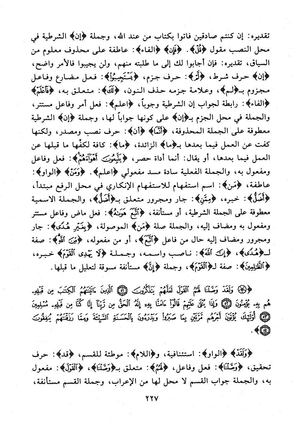 تقديره: إن كنتم صادقين فاتوا بكتاب من عند الله، وجملة {إن} الشرطية في محل النصب مقول {قُلْ}. {فَإنِ} {الفاء}: عاطفة على محذوف معلوم من السياق، تقديره: فإن أجابوا لك إلى ما طلبته منهم، ولن يجيبوا فالأمر واضح، {إن} حرف شرط، {لَمْ}: حرف جزم، {يَسْتَجِيبُوا}: فعل مضارع وفاعل مجزوم بـ {لم}، وعلامة جزمه حذف النون، {لَكَ}: متعلق به، {فَاعْلَمْ} {الفاء}: رابطة لجواب إن الشرطية وجوبًا، {اعلم}: فعل أمر وفاعل مستتر، والجملة في محل الجزم بـ {إن} على كونها جوابًا لها، وجملة {إن} الشرطية معطوفة على الجملة المحذوفة، {أَنَّمَا} {أن}: حرف نصب ومصدر، ولكنها كفت عن العمل فيما بعدها بـ {ما} الزائدة، {ما}: كافة لكفِّها ما قبلها عن العمل فيما بعدها، أو يقال: أنما أداة حصر، {يَتَّبِعُونَ أَهْوَاءَهُمْ}: فعل وفاعل ومفعول به، والجملة الفعلية سادة مسد مفعولي {اعلم}. {وَمَنْ} {الواو}: عاطفة، {مَن}: اسم استفهام للاستفهام الإنكاري في محل الرفع مبتدأ، {أَضَلُّ}: خبره، {مِمَّنِ}: جار ومجرور متعلق بـ {أَضَلُّ}، والجملة الاسمية معطوفة على الجملة الشرطية، أو مستأنفة، {اتَّبَعَ هَوَاهُ}: فعل ماض وفاعل مستتر ومفعول به ومضاف إليه، والجملة صلة {مِنَ} الموصولة، {بِغَيْرِ هُدًى}: جار ومجرور ومضاف إليه حال من فاعل {اتَّبَعَ}، أو من مفعوله، {مِنَ اللَّهِ}: صفة لـ {هُدًى}، {إِنَّ اللَّهَ}: ناصب واسمه، وجملة {لَا يَهْدِي الْقَوْمَ} خبره، {الظَّالِمِينَ}: صفة لـ {الْقَوْمَ}، وجملة {إنَّ} مستأنفة مسوقة لتعليل ما قبلها.