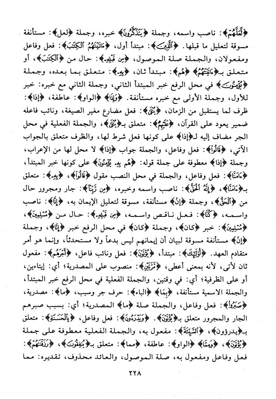 {لَعَلَّهُمْ}: ناصب واسمه، وجملة {يَتَذَكَّرُونَ} خبره، وجملة {لعل}: مستأنفة مسوقة لتعليل ما قبلها. {الَّذِينَ}: مبتدأ أول, {آتَيْنَاهُمُ الْكِتَابَ}: فعل وفاعل ومفعولان، والجملة صلة الموصول، {مِنْ قَبْلِهِ}: حال من {الْكِتَابَ}، أو متعلق بـ {آتَيْنَاهُمُ} {هُمْ}: مبتدأ ثان، {بِهِ}: متعلق بما بعده، وجملة {يُؤْمِنُونَ} في محل الرفع خبر المبتدأ الثاني، وجملة الثاني مع خبره: خبر للأول، وجملة الأولى مع خبره مستأنفة. {وَإِذَا} {الواو}: عاطفة، {إذا}: ظرف لما يستقبل من الزمان، {يُتْلَى}: فعل مضارع مغير الصيغة، ونائب فاعله ضمير يعود على القرآن، {عَلَيْهِمْ}: متعلق بـ {يُتْلَى}، والجملة الفعلية في محل الجر مضاف إليه لـ {إذا} على كونها فعل شرط لها، والظرف متعلق بالجواب الآتي، {قَالُوا}: فعل وفاعل، والجملة جواب {إذا} لا محل لها من الإعراب، وجملة {إذا} معطوفة على جملة قوله: {هُمْ بِهِ يُؤْمِنُونَ} على كونها خبر المبتدأ، {آمَنَّا} فعل وفاعل، والجملة في محل النصب مقول {قَالُوا}، {بِهِ}: متعلق بـ {آمَنَّا}، {إِنَّهُ الْحَقُّ}: ناصب واسمه وخبره، {مِنْ رَبِّنَا}: جار ومجرور حال من {الْحَقُّ}، وجملة {إن} مستأنفة، مسوقة لتعليل الإيمان به، {إِنَّا}: ناصب واسمه، {كُنَّا}: فعل ناقص واسمه، {مِنْ قَبْلِهِ}: حال من {مُسْلِمِينَ}، {مُسْلِمِينَ}: خبر {كان}، وجملة {كان} في محل الرفع خبر {إِنَّا}، وجملة {إن} مستأنفة مسوقة لبيان أن إيمانهم ليس بدعًا ولا مستحدثًا، وإنما هو أمر متقادم العهد. {أُولَئِكَ}: مبتدأ، {يُؤْتَوْنَ}: فعل ونائب فاعل، {أَجْرَهُمْ}: مفعول ثان لأتى, لأنه بمعنى أعطى، {مَرَّتَيْنِ}: منصوب على المصدرية؛ أي: إيتاءين، أو على الظرفية؛ أي: في وقتين، والجملة الفعلية في محل الرفع خبر المبتدأ، والجملة الاسمية مستأنفة، {بِمَا} {الباء}: حرف جر وسبب، {ما}: مصدرية، {صَبَرُوا}: فعل وفاعل، والجملة صلة {ما} المصدرية؛ أي: بسبب صبرهم الجار والمجرور متعلق بـ {يُؤْتَوْنَ}. {وَيَدْرَءُونَ}: فعل وفاعل، {بِالْحَسَنَةِ}: متعلق بـ {وَيَدْرَءُونَ}، {السَّيِّئَةَ}: مفعول به، والجملة الفعلية معطوفة على جملة {يُؤْتَوْنَ}، {وَمِمَّا} {الواو}: عاطفة، {مما}: متعلق بـ {يُنْفِقُونَ}، {رَزَقْنَاهُمْ}: فعل وفاعل ومفعول به، صلة الموصول، والعائد محذوف، تقديره: مما