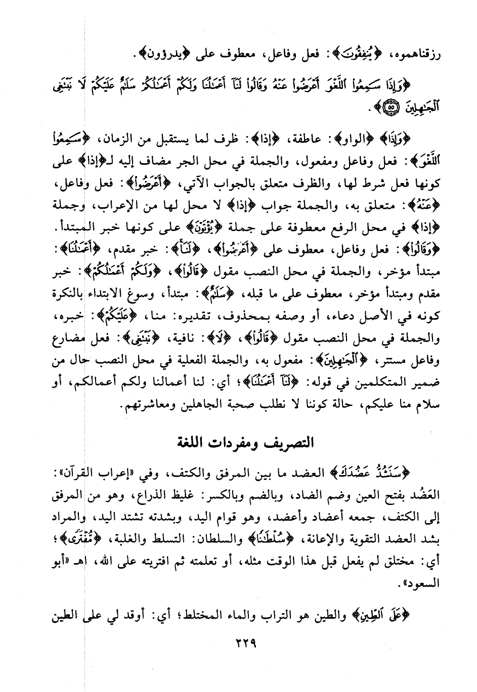 {وَإِذَا} {الواو}: عاطفة، {إذا}: ظرف لما يستقبل من الزمان، {سَمِعُوا اللَّغْوَ}: فعل وفاعل ومفعول، والجملة في محل الجر مضاف إليه لـ {إذا} على كونها فعل شرط لها، والظرف متعلق بالجواب الآتي، {أَعْرَضُوا}: فعل وفاعل، {عَنْهُ}: متعلق به، والجملة جواب {إذا} لا محل لها من الإعراب، وجملة {إذا} في محل الرفع معطوفة على جملة {يُؤْتَوْنَ} على كونها خبر المبتدأ. {وَقَالُوا}: فعل وفاعل، معطوف على {أَعْرَضُوا}، {لَنَا}: خبر مقدم، {أَعْمَالُنَا}: مبتدأ مؤخر، والجملة في محل النصب مقول {قَالُوا}، {وَلَكُمْ أَعْمَالُكُمْ}: خبر مقدم ومبتدأ مؤخر، معطوف على ما قبله، {سَلَامٌ}: مبتدأ، وسوغ الابتداء بالنكرة كونه في الأصل دعاء، أو وصفه بمحذوف، تقديره: منا، {عَلَيْكُمْ}: خبره، والجملة في محل النصب مقول {قَالُوا}، {لَا}: نافية، {نَبْتَغِي}: فعل مضارع وفاعل مستتر، {الْجَاهِلِينَ}: مفعول به، والجملة الفعلية في محل النصب حال من ضمير المتكلمين في قوله: {لَنَا أَعْمَالُنَا}؛ أي: لنا أعمالنا ولكم أعمالكم، أو سلام منا عليكم، حالة كوننا لا نطلب صحبة الجاهلين ومعاشرتهم.