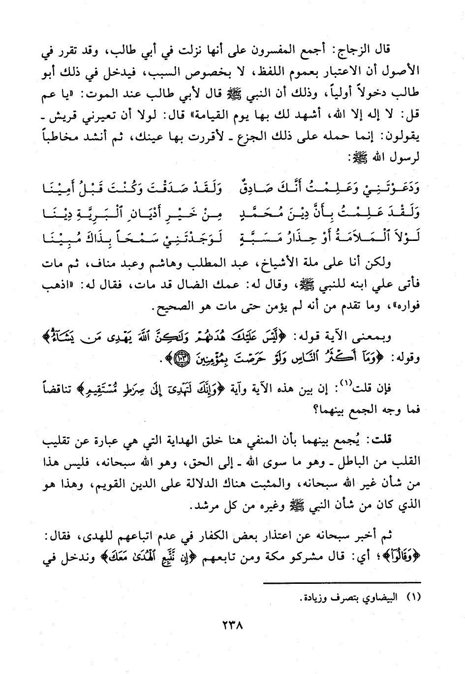 ولكن أنا على ملة الأشياخ، عبد المطلب وهاشم وعبد مناف، ثم مات فأتى علي ابنه للنبي - صلى الله عليه وسلم -، وقال له: عمك الضال قد مات، فقال له: "اذهب فواره"، وما تقدم من أنه لم يؤمن حتى مات هو الصحيح.