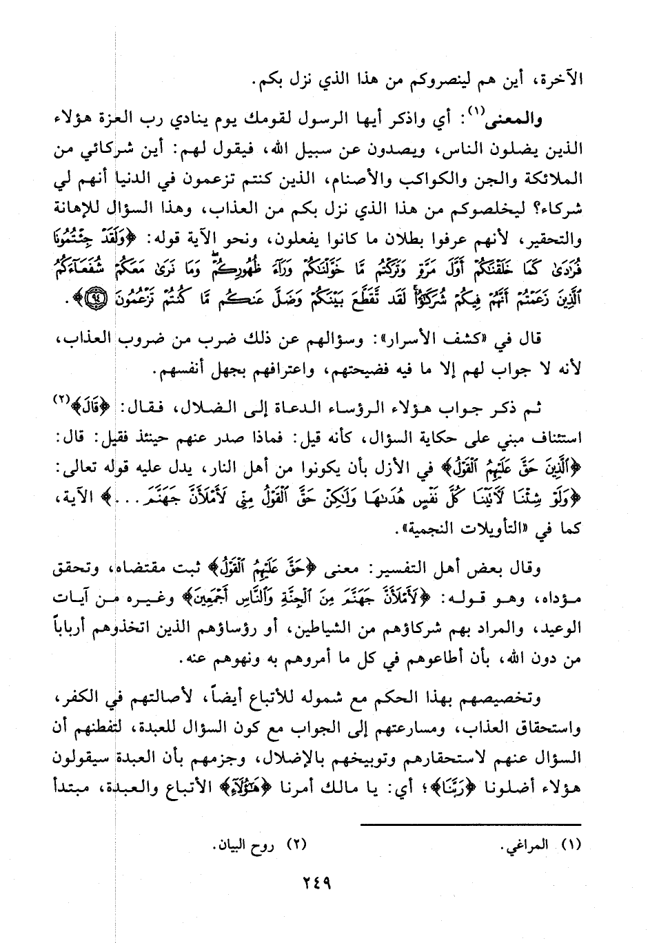 63 - ثم ذكر جواب هؤلاء الرؤساء الدعاة إلى الضلال، فقال: {قَالَ} (¬2) استئناف مبني على حكاية السؤال، كأنه قيل: فماذا صدر عنهم حينئذ فقيل: قال: {الَّذِينَ حَقَّ عَلَيْهِمُ الْقَوْلُ} في الأزل بأن يكونوا من أهل النار، يدل عليه قوله تعالى: {وَلَوْ شِئْنَا لَآتَيْنَا كُلَّ نَفْسٍ هُدَاهَا وَلَكِنْ حَقَّ الْقَوْلُ مِنِّي لَأَمْلَأَنَّ جَهَنَّمَ ...} الآية، كما في "التأويلات النجمية".