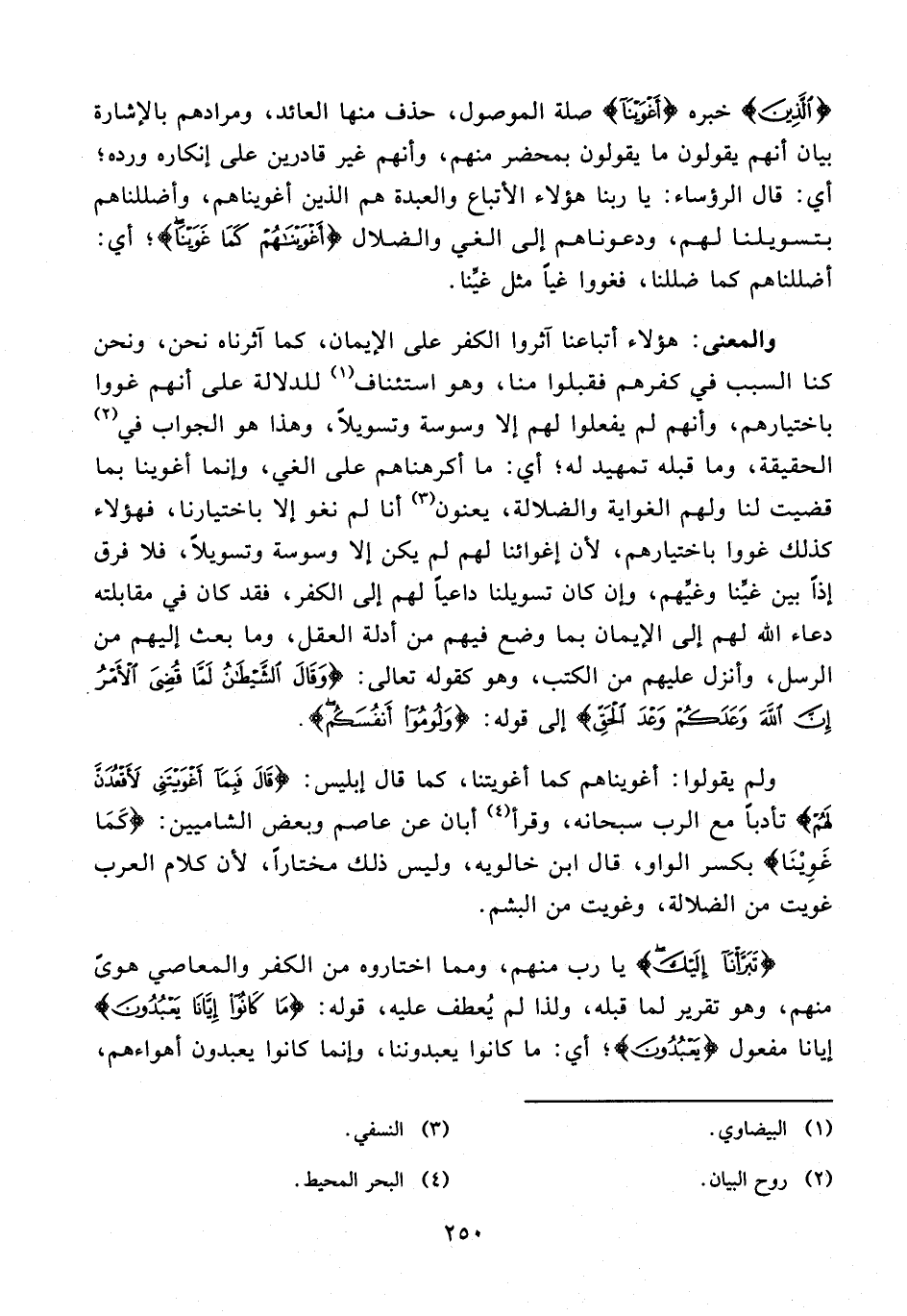 والمعنى: هؤلاء أتباعنا آثروا الكفر على الإيمان، كما آثرناه نحن، ونحن كنا السبب في كفرهم فقبلوا منا، وهو استئناف (¬1) للدلالة على أنهم غووا باختيارهم، وأنهم لم يفعلوا لهم إلا وسوسة وتسويلًا، وهذا هو الجواب في (¬2) الحقيقة، وما قبله تمهيد له؛ أي: ما أكرهناهم على الغي، وإنما أغوينا بما قضيت لنا ولهم الغواية والضلالة، يعنون (¬3) أنا لم نغو إلا باختيارنا، فهؤلاء كذلك غووا باختيارهم؛ لأن إغوائنا لهم لم يكن إلا وسوسة وتسويلًا، فلا فرق إذًا بين غيِّنا وغيِّهم، وإن كان تسويلنا داعيًا لهم إلى الكفر، فقد كان في مقابلته دعاء الله لهم إلى الإيمان بما وضع فيهم من أدلة العقل، وما بعث إليهم من الرسل، وأنزل عليهم من الكتب، وهو كقوله تعالى: {وَقَالَ الشَّيْطَانُ لَمَّا قُضِيَ الْأَمْرُ إِنَّ اللَّهَ وَعَدَكُمْ وَعْدَ الْحَقِّ} إلى قوله: {وَلُومُوا أَنْفُسَكُمْ}.