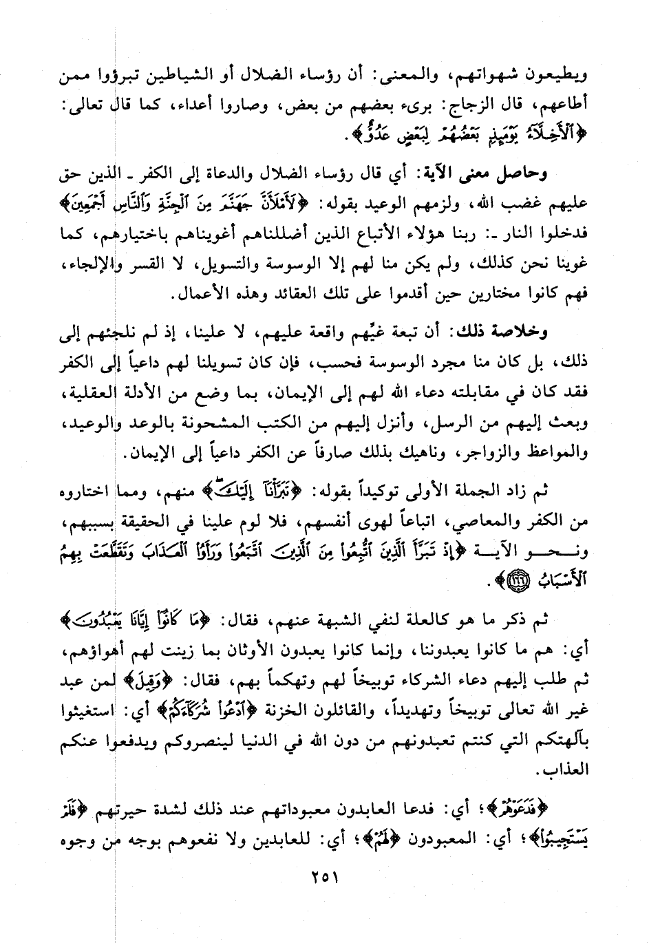 وخلاصة ذلك: أن تبعة غيِّهم واقعة عليهم، لا علينا، إذ لم نلجئهم إلى ذلك، بل كان منا مجرد الوسوسة فحسب، فإن كان تسويلنا لهم داعيًا إلى الكفر فقد كان في مقابلته دعاء الله لهم إلى الإيمان، بما وضع من الأدلة العقلية، وبعث إليهم من الرسل، وأنزل إليهم من الكتب المشحونة بالوعد والوعيد، والمواعظ والزواجر، وناهيك بذلك صارفًا عن الكفر داعيًا إلى الإيمان.