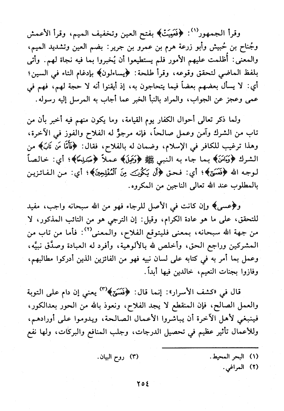 قال في "كشف الأسرار": إنما قال: {فَعَسَى} (¬3) يعني إن دام على التوبة والعمل الصالح، فإن المنقطع لا يجد الفلاح، ونعوذ بالله من الحور بعد الكور، فينبغي لأهل الآخرة أن يباشروا الأعمال الصالحة، ويدوموا على أورادهم، وللأعمال تأثير عظيم في تحصيل الدرجات، وجلب المنافع والبركات، ولها نفع