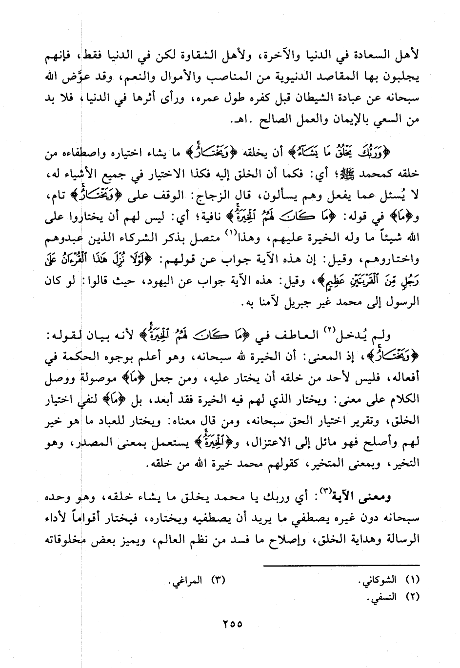 ومعنى الآية (¬3): أي وربك يا محمد يخلق ما يشاء خلقه، وهو وحده سبحانه دون غيره يصطفي ما يريد أن يصطفيه ويختاره، فيختار أقوامًا لأداء الرسالة وهداية الخلق، وإصلاح ما فسد من نظم العالم، ويميز بعض مخلوقاته