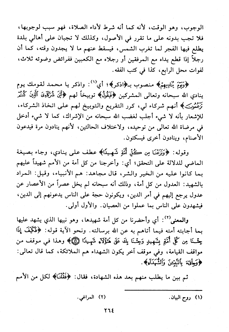 75 - وقوله: {وَنَزَعْنَا مِنْ كُلِّ أُمَّةٍ شَهِيدًا} عطف على ينادي، وجاء بصيغة الماضي للدلالة على التحقق؛ أي: وأخرجنا من كل أمة من الأمم شهيدًا عليهم بما كانوا عليه من الخير والشر، قال مجاهد: هم الأنبياء، وقيل: المراد بالشهيد: العدول من كل أمة، وذلك أنه سبحانه لم يخل عصرًا من الأعصار عن عدول يرجع إليهم في أمر الدين، ويكونون حجة على الناس يدعونهم إلى الدين، فيشهدون على الناس بما عملوا من العصيان. والأول أولى.