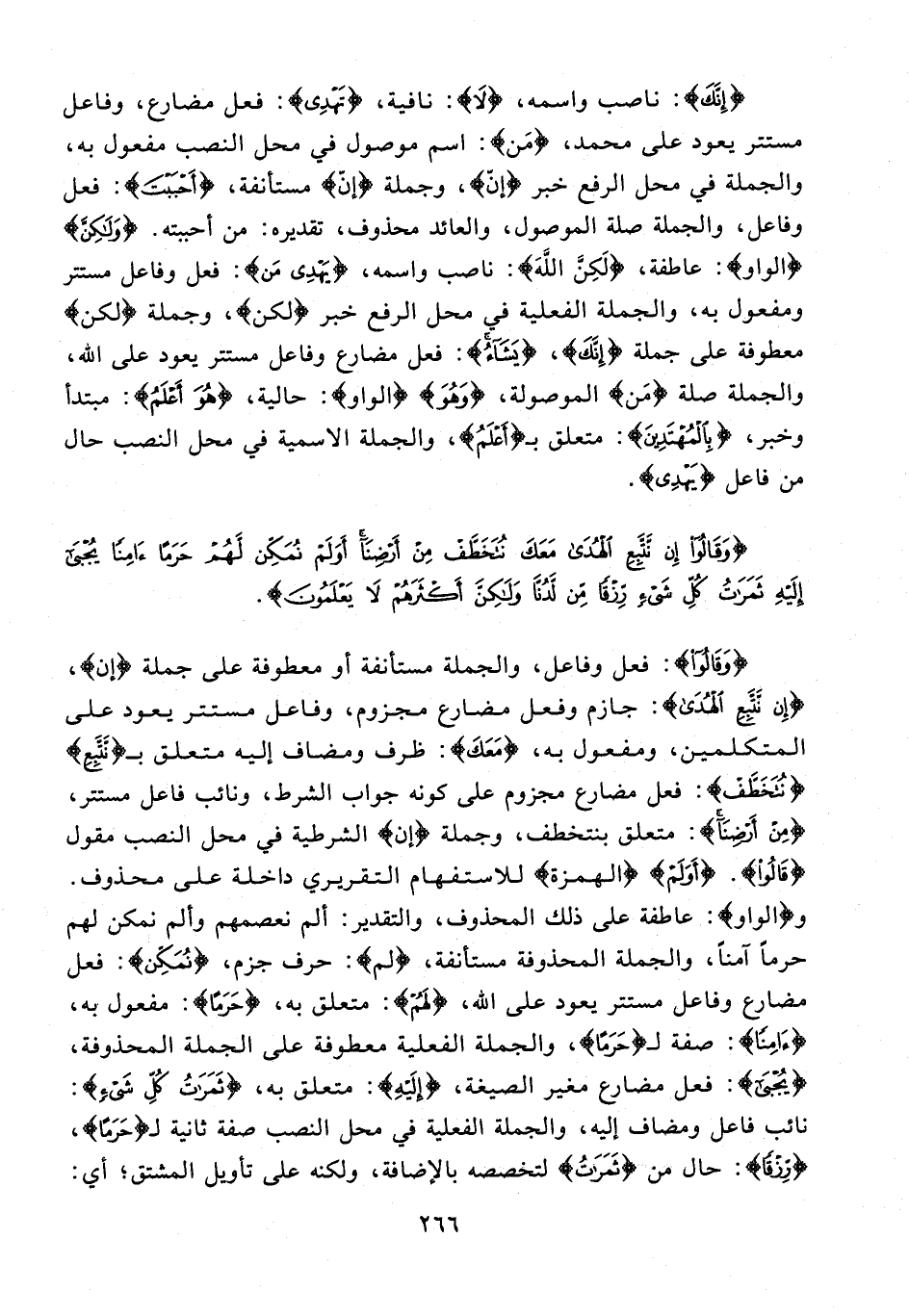 {وَقَالُوا}: فعل وفاعل، والجملة مستأنفة أو معطوفة على جملة {إن}، {إِنْ نَتَّبِعِ الْهُدَى}: جازم وفعل مضارع مجزوم، وفاعل مستتر يعود على المتكلمين، ومفعول به، {مَعَكَ}: ظرف ومضاف إليه متعلق بـ {نَتَّبِعِ} {نُتَخَطَّفْ}: فعل مضارع مجزوم على كونه جواب الشرط، ونائب فاعل مستتر، {مِنْ أَرْضِنَا}: متعلق بنتخطف، وجملة {إن} الشرطية في محل النصب مقول {قَالُوا}. {أَوَلَمْ} {الهمزة} للاستفهام التقريري داخلة على محذوف. و {الواو}: عاطفة على ذلك المحذوف، والتقدير: ألم نعصمهم وأم نمكن لهم حرمًا آمنًا، والجملة المحذوفة مستأنفة، {لم}: حرف جزم، {نُمَكِّنْ}: فعل مضارع وفاعل مستتر يعود على الله، {لَهُمْ}: متعلق به، {حَرَمًا}: مفعول به، {آمِنًا}: صفة لـ {حَرَمًا}، والجملة الفعلية معطوفة على الجملة المحذوفة، {يُجْبَى}: فعل مضارع مغير الصيغة، {إِلَيْهِ}: متعلق به، {ثَمَرَاتُ كُلِّ شَيْءٍ}: نائب فاعل ومضاف إليه، والجملة الفعلية في محل النصب صفة ثانية لـ {حَرَمًا} {رِزْقًا}: حال من {ثَمَرَاتُ} لتخصصه بالإضافة، ولكنه على تأويل المشتق؛ أي: