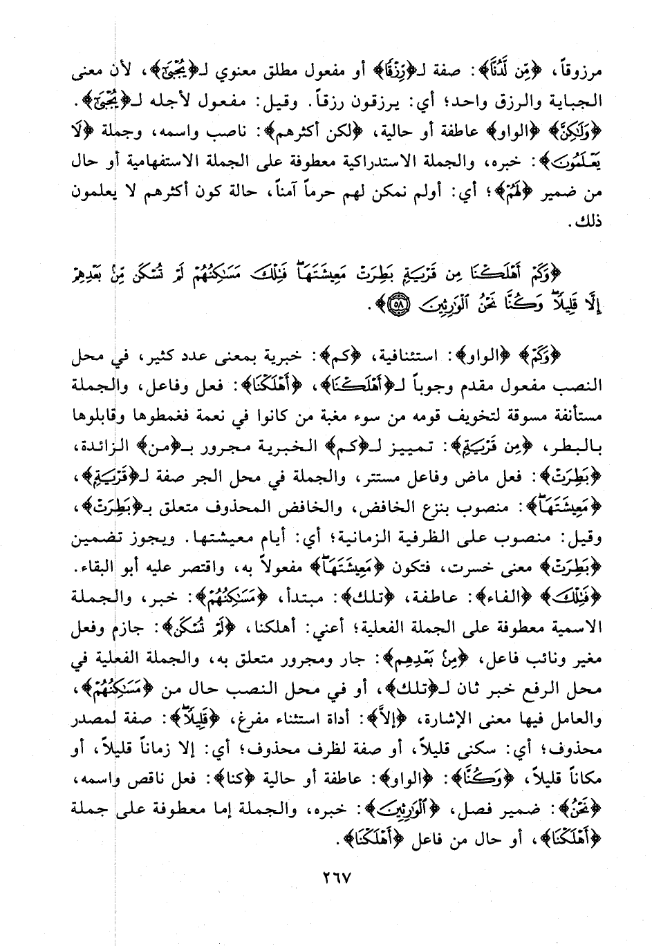 {وَكَمْ} {الواو}: استئنافية، {كَمْ}: خبرية بمعنى عدد كثير، في محل النصب مفعول مقدم وجوبًا لـ {أَهْلَكْنَا}، {أَهْلَكْنَا}: فعل وفاعل، والجملة مستأنفة مسوقة لتخويف قومه من سوء مغبة من كانوا في نعمة فغمطوها وقابلوها بالبطر، {مِنْ قَرْيَةٍ}: تمييز لـ {كَمْ} الخبرية مجرور بـ {من} الزائدة، {بَطِرَتْ}: فعل ماض وفاعل مستتر، والجملة في محل الجر صفة لـ {قَرْيَةٍ}، {مَعِيشَتَهَا}: منصوب بنزع الخافض، والخافض المحذوف متعلق بـ {بَطِرَتْ}، وقيل: منصوب على الظرفية الزمانية؛ أي: أيام معيشتها. ويجوز تضمين {بَطِرَتْ} معنى خسرت، فتكون {مَعِيشَتَهَا} مفعولًا به، واقتصر عليه أبو البقاء. {فَتِلْكَ} {الفاء}: عاطفة، {تِلْكَ}: مبتدأ، {مَسَاكِنُهُمْ}: خبر، والجملة الاسمية معطوفة على الجملة الفعلية؛ أعني: أهلكنا، {لَمْ تُسْكَنْ}: جازم وفعل مغير ونائب فاعل، {مِنْ بَعْدِهِمْ} جار ومجرور متعلق به، والجملة الفعلية في محل الرفع خبر ثان لـ {تِلْكَ}، أو في محل النصب حال من {مَسَاكِنُهُمْ}، والعامل فيها معنى الإشارة، {إِلَّا}: أداة استثناء مفرغ، {قَلِيلًا}: صفة لمصدر محذوف؛ أي: سكنى قليلًا، أو صفة لظرف محذوف؛ أي: إلا زمانًا قليلًا، أو مكانًا قليلًا، {وَكُنَّا}: {الواو}: عاطفة أو حالية {كُنَّا}: فعل ناقص واسمه، {نَحْنُ}: ضمير فصل، {الْوَارِثِينَ}: خبره، والجملة إما معطوفة على جملة {أَهْلَكْنَا}، أو حال من فاعل {أَهْلَكْنَا}.