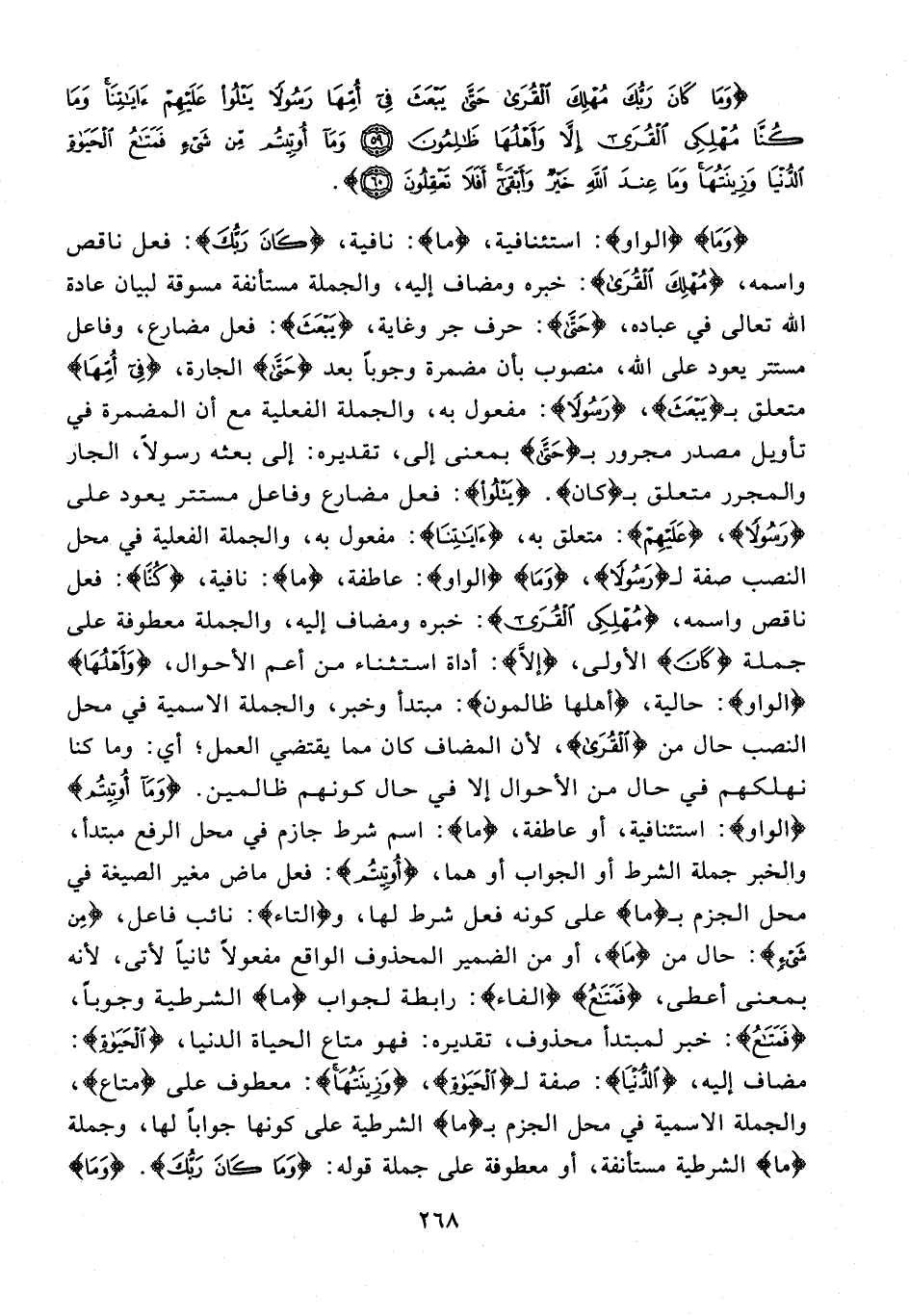 {وَمَا} {الواو}: استئنافية، {ما}: نافية، {كَانَ رَبُّكَ} فعل ناقص واسمه، {مُهْلِكَ الْقُرَى}: خبره ومضاف إليه، والجملة مستأنفة مسوقة لبيان عادة الله تعالى في عباده، {حَتَّى}: حرف جر وغاية، {يَبْعَثَ}: فعل مضارع، وفاعل مستتر يعود على الله، منصوب بأن مضمرة وجوبًا بعد {حَتَّى} الجارة، {فِي أُمِّهَا} متعلق بـ {يَبْعَثَ}، {رَسُولًا}: مفعول به، والجملة الفعلية مع أن المضمرة في تأويل مصدر مجرور بـ {حَتَّى} بمعنى إلى، تقديره: إلى بعثه رسولًا، الجار والمجرر متعلق بـ {كَانَ}. {يَتْلُوا}: فعل مضارع وفاعل مستتر يعود على {رَسُولًا}، {عَلَيْهِمْ}: متعلق به، {آيَاتِنَا}: مفعول به، والجملة الفعلية في محل النصب صفة لـ {رَسُولًا}، {وَمَا} {الواو}: عاطفة، {ما}: نافية، {كُنَّا}: فعل ناقص واسمه، {مُهْلِكِي الْقُرَى}: خبره ومضاف إليه، والجملة معطوفة على جملة {كَانَ} الأولى، {إِلَّا}: أداة استثناء من أعم الأحوال، {وَأَهْلُهَا} {الواو}: حالية، {أَهْلُهَا ظَالِمُونَ}: مبتدأ وخبر، والجملة الاسمية في محل النصب حال من {الْقُرَى}؛ لأن المضاف كان مما يقتضي العمل؛ أي: وما كنا نهلكهم في حال من الأحوال إلا في حال كونهم ظالمين. {وَمَا أُوتِيتُمْ} {الواو}: استئنافية، أو عاطفة، {ما}: اسم شرط جازم في محل الرفع مبتدأ، والخبر جملة الشرط أو الجواب أو هما، {أُوتِيتُمْ}: فعل ماض مغير الصيغة في محل الجزم بـ {ما} على كونه فعل شرط لها، و {التاء}: نائب فاعل، {مِنْ شَيْءٍ}: حال من {مَا}، أو من الضمير المحذوف الواقع مفعولًا ثانيًا لأتى؛ لأنه بمعنى أعطى، {فَمَتَاعُ}: {الفاء} رابطة لجواب {ما} الشرطية وجوبًا، {فَمَتَاعُ}: خبر لمبتدأ محذوف، تقديره: فهو متاع الحياة الدنيا، {الْحَيَاةِ}: مضاف إليه، {الدُّنْيَا}: صفة لـ {الْحَيَاةِ}، {وَزِينتُهَا}: معطوف على {مَتَاعُ}، والجملة الاسمية في محل الجزم بـ {ما} الشرطية على كونها جوابًا لها، وجملة {ما} الشرطية مستأنفة، أو معطوفة على جملة قوله: {وَمَا كَانَ رَبُّكَ}. {وَمَا}